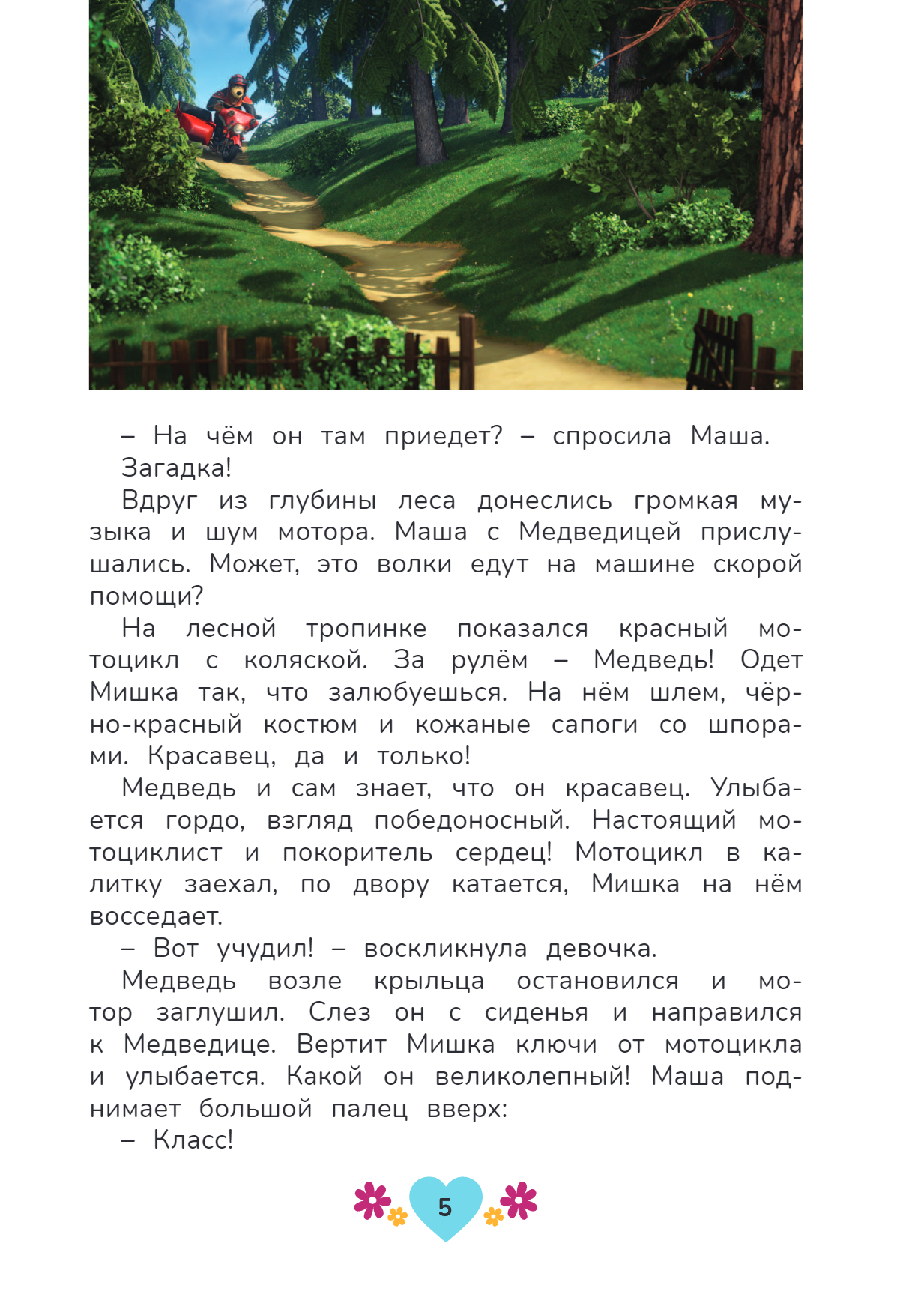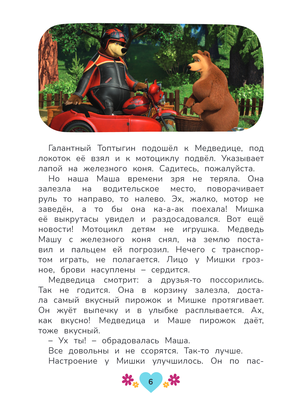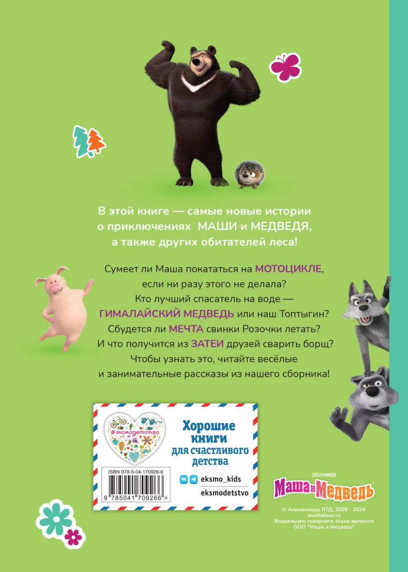 В книге собраны 5 увлекательных рассказов про Машу, Медведя и других обитателей леса. Сумеет ли Маша покататься на мотоцикле, если ни разу этого не делала? Кто лучший спасатель на воде – Гималайский медведь или наш Топтыгин? Сбудется ли мечта свинки Розочки летать? И что получится из затеи друзей сварить борщ? Чтобы узнать это, читайте весёлые и занимательные рассказы нашего сборника.