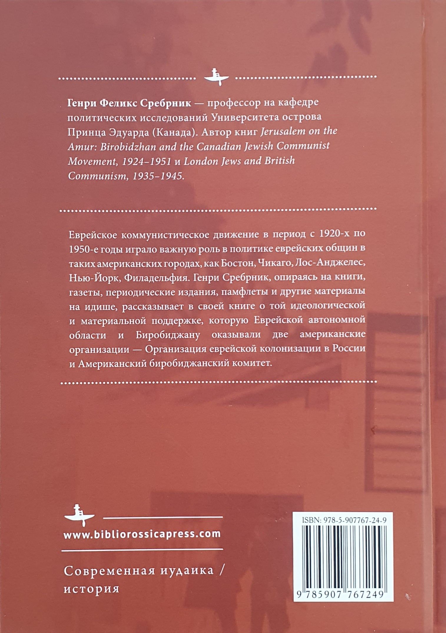 Еврейское коммунистическое движение в период с 1920-х по 1950-е годы играло важную роль в политике еврейских общин в таких американских городах, как Бостон, Чикаго, Лос-Анджелес, Нью-Йорк, Филадельфия. Опираясь на книги, газеты, периодические издания, памфлеты и другие материалы на идише, Генри Сребрник рассказывает о той идеологической и материальной поддержке, которую Еврейской автономной области Биробиджана оказывали две американские орга- низации — Организация еврейской колонизации в России и Американский Биробиджанский комитет.
