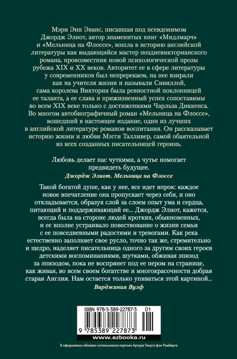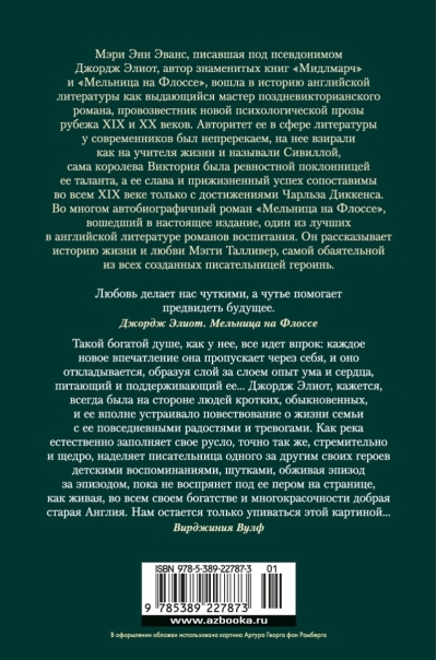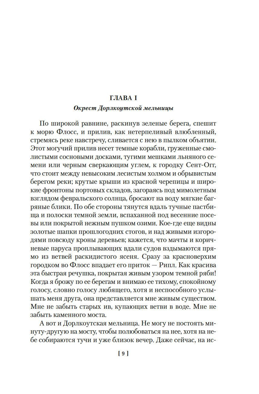 Мэри Энн Эванс, писавшая под псевдонимом Джордж Элиот, автор знаменитых книг «Мидлмарч» и «Мельница на Флоссе», вошла в историю английской литературы как выдающийся мастер поздневикторианского романа, провозвестник новой психологической прозы рубежа XIX и XX веков. Авторитет ее в сфере литературы у современников был непререкаем, на нее взирали как на учителя жизни и называли Сивиллой, сама королева Виктория была ревностной поклонницей ее таланта, а ее слава и прижизненный успех сопоставимы во всем XIX веке только с достижениями Чарльза Диккенса. Во многом автобиографичный роман «Мельница на Флоссе», вошедший в настоящее издание, один из лучших в английской литературе романов воспитания. Он рассказывает историю жизни и любви Мэгги Талливер, самой обаятельной из всех созданных писательницей героинь.
