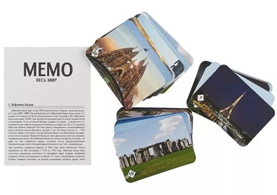 «Мемо» - игра действительно интересная и удивительно полезная! Она с лёгкостью поднимет настроение большой и маленькой компании. Вы станете поклонником этой игры, попробовав сыграть лишь однажды. «Мемо» - одна из тех редких игр, где успех чаше зависит от способностей и стараний игрока, чем от удачи. «Мемо» - полезная игра с простыми правилами, где дети могут выиграть без «поддавков» у взрослых! Игра состоит из карточек с парными изображениями. Всего 25 пар (50 карточек). Вы и не заметите, как запомните всё, что изображено на карточках. Это игра, безусловно, расширяет кругозор, развивает внимание, тренирует память. Также в комплекте вы найдёте буклет с описанием всех мест, изображённых на карточках. Наверняка, вы узнаете много нового. А если у вас есть карта мира, то вы можете усложнить игру, добавив в неё задание, где ребёнку предлагается расположить карточку в соответствии с её реальным местоположением на карте. А может быть, после этого вы захотите всей семьёй увидеть воочию это место?! Ведь в России и мире есть столько удивительных мест, где действительно стоит побывать! Играйте в «Мемо» и путешествуйте с удовольствием! И, наконец, «Мемо» - это всегда хороший подарок, который одинаково подходит как для мальчиков, так и для девочек.