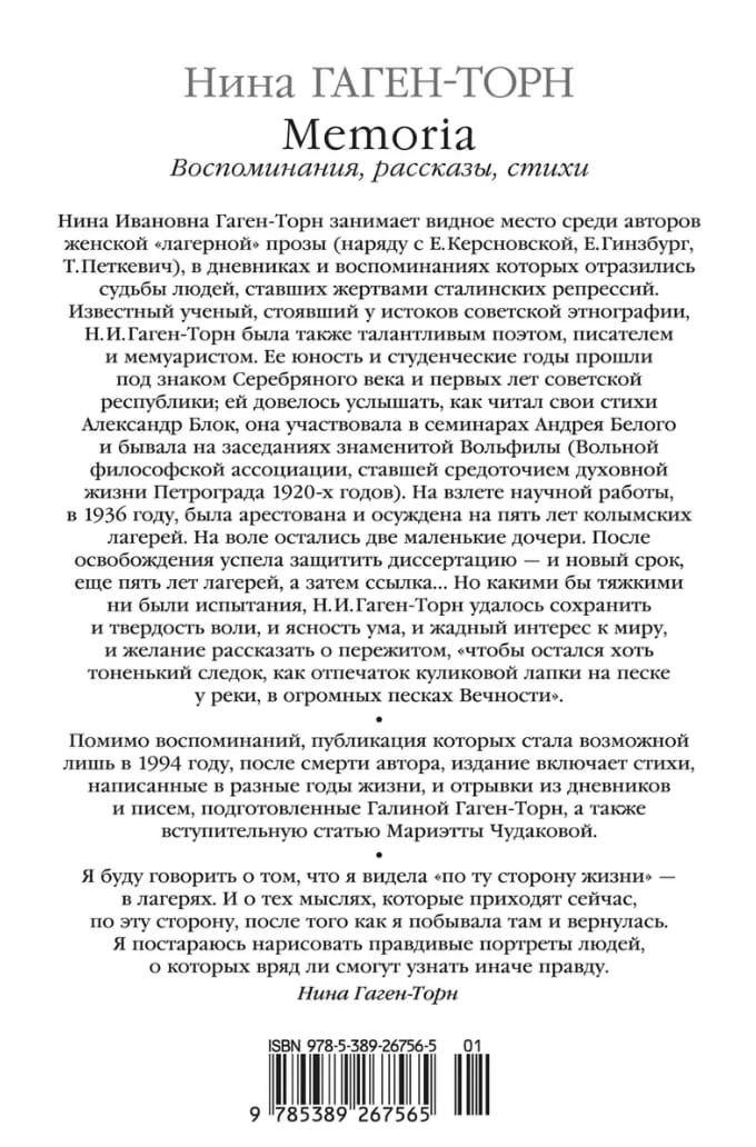 Нина Ивановна Гаген-Торн занимает видное место среди авторов женской «лагерной» прозы (наряду с Е. Керсновской, Е. Гинзбург, Т. Петкевич), в дневниках и воспоминаниях которых отразились судьбы людей, ставших жертвами сталинских репрессий. Известный ученый, стоявший у истоков советской этнографии, Н. И. Гаген-Торн была также талантливым поэтом, писателем и мемуаристом. Ее юность и студенческие годы прошли под знаком Серебряного века и первых лет советской республики; ей довелось услышать, как читал свои стихи Александр Блок, она участвовала в семинарах Андрея Белого и бывала на заседаниях знаменитой Вольфилы (Вольной философской ассоциации, ставшей средоточием духовной жизни Петрограда 1920-х годов). На взлете научной работы, в 1936 году, была арестована и осуждена на пять лет колымских лагерей. На воле остались две маленькие дочери. После освобождения успела защитить диссертацию — и новый срок, еще пять лет лагерей, а затем ссылка… Но какими бы тяжкими ни были испытания, Н. И. Гаген-Торн удалось сохранить и твердость воли, и ясность ума, и жадный интерес к миру, и желание рассказать о пережитом, «чтобы остался хоть тоненький следок, как отпечаток куликовой лапки на песке у реки, в огромных песках Вечности». Помимо воспоминаний, публикация которых стала возможной лишь в 1994 году, после смерти автора, издание включает стихи, написанные в разные годы жизни, и отрывки из дневников и писем, подготовленные Галиной Гаген-Торн, а также вступительную статью Мариэтты Чудаковой.