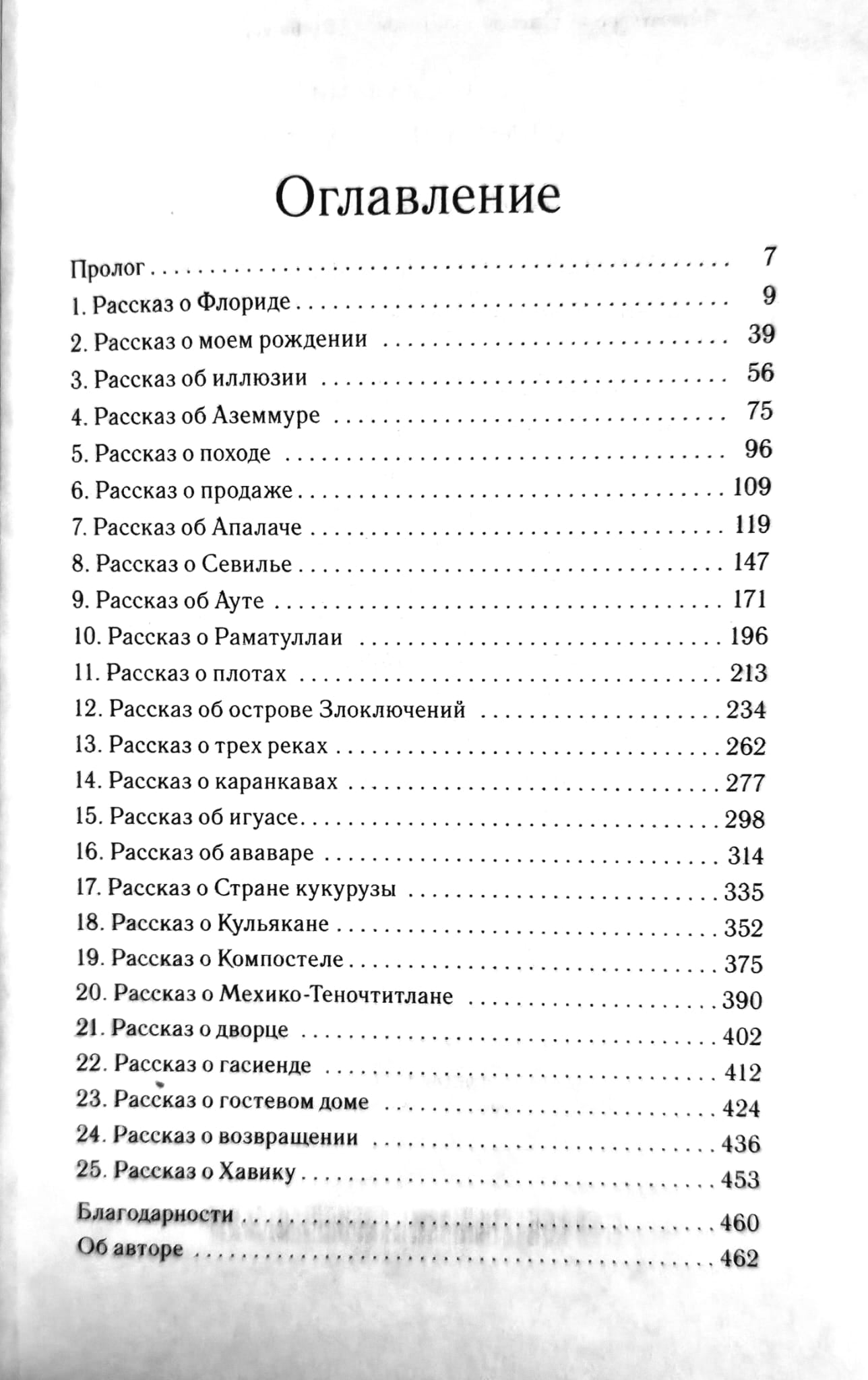 В 1527 году конкистадор Панфило де Нарваэс отплыл из испанского порта, чтобы заявить права испанской короны на земли побережья Мексиканского залива и обрести богатство и славу, подобные тем, что снискал Эрнан Кортес; на борту его корабля было шестьсот человек и почти сотня лошадей. Но с момента высадки экспедиции Нарваэса во Флориде ее преследовали неудачи — навигационные ошибки, болезни, голод, сопротивление коренных племен… Уже через год в живых остались лишь четверо: казначей экспедиции Кабеса-де-Вака, идальго Алонсо дель Кастильо, Андрес Дорантес и его марокканский раб Мустафа аль-Замори, или Эстебанико, как его прозвали испанцы. Четверым незадачливым завоевателям предстоит долгое путешествие по Америке, которое превратит гордых конкистадоров в смиренных слуг, а потом в запуганных беглецов и целителей-проповедников.