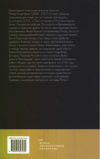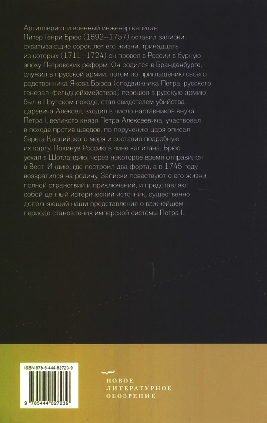Артиллерист и военный инженер капитан Питер Генри Брюс (1692–1757) оставил записки, охватывающие сорок лет его жизни, тринадцать из которых (1711–1724) он провел в России в бурную эпоху Петровских реформ. Он родился в Бранденбурге, служил в прусской армии, потом по приглашению своего родственника Якова Брюса (сподвижника Петра, русского генерал-фельдцейхмейстера) перешел в русскую армию, был в Прутском походе, стал свидетелем убийства царевича Алексея, входил в число наставников внука Петра I, великого князя Петра Алексеевича, участвовал в походе против шведов, по поручению царя описал берега Каспийского моря и составил подробную их карту. Покинув Россию в чине капитана, Брюс уехал в Шотландию, через некоторое время отправился в Вест-Индию, где построил два форта, а в 1745 году возвратился на родину. Записки повествуют о его жизни, полной странствий и приключений, и представляют собой ценный исторический источник, существенно дополняющий наши представления о важнейшем периоде становления имперской системы Петра I.