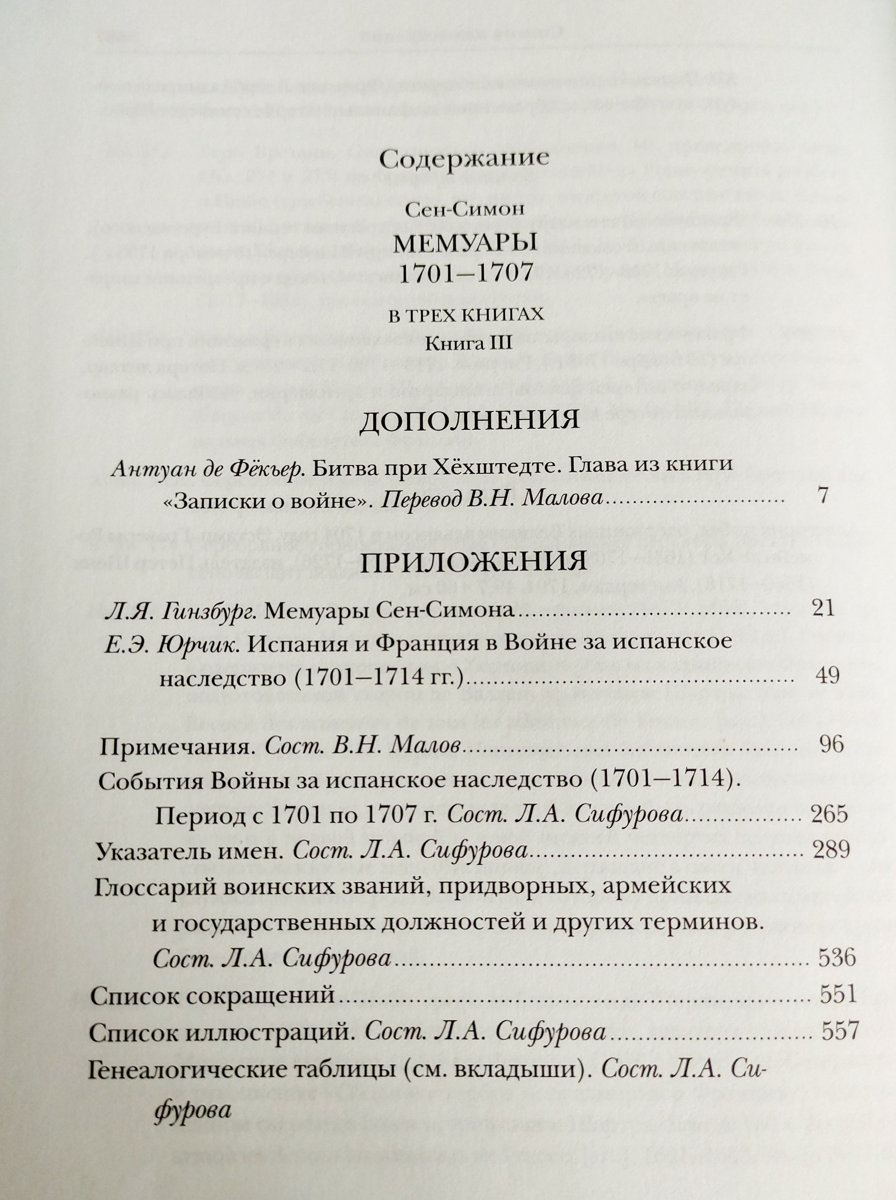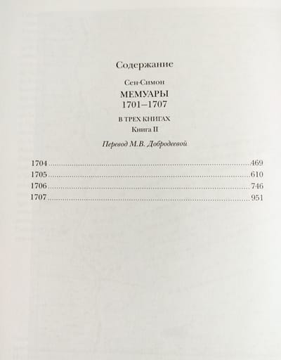 Второй том «Мемуаров» герцога де Сен-Симона (1675 — 1755; Луи де Рувруа, герцог де Сен-Симон; французское Louis de Rouvroy, duc de Saint-Simon) отмечен событиями, произошедшими с 1701-го (последнего, по выражению мемуариста, счастливого года в жизни Людовика XIV) по 1707 год. В 1701 году началась Война за испанское наследство (1701—1714 годы), и Луи де Рувруа де Сен-Симон подробно описывает и анализирует большие и малые баталии на разных театрах войны в Германии, Фландрии, Испании и Северной Италии: сухопутные сражения при Карпи и Кьяри (1701 год), при Луццаре и Фридлингене (1702 год), при Хёхштедте (Бленхейме) (1703 год и 1704 год) и Шпейере (1703 год), при Рамийи (1706 год) и Альмансе (1707 год), вылазку имперцев в Кремоне (1702 год), битвы за Барселону (1705 год) и Турин (1706 год), бесчисленные осады городов, морские схватки в бухте Виго (1702 год) и у Гибралтара (1704 год) и многое другое. Автор рисует колоритные портреты французских военачальников высокого и низкого ранга; рассуждает о патриотизме; наглядно показывает, как личные качества полководцев и чиновников, ответственных за снабжение войск, влияли на исход сражений и целых военных кампаний, во время которых храбрость соседствовала с трусостью, а верность долгу — с предательством. Литературное дарование мемуариста разворачивается во всю мощь, когда он рассказывает о преследовавших Францию горестных поражениях и о редких в те годы победах. Наряду с персонажами, уже участвовавшими в событиях, охваченных первым томом “Мемуаров” Луи де Рувруа де Сен-Симона (1691—1701 годы), впервые появляются в повествовании или начинают действовать гораздо активнее и многие другие личности, выдвинувшиеся на авансцену истории в переломные моменты: полководцы Евгений Савойский и его кузен Людвиг Баденский, герцог Мальборо и целая плеяда маршалов Франции, эрцгерцог Карл, принцесса Орсини, Ференц Ракоци, шведский король Карл XII, Антоний Гейнзиус, английская королева Анна, герцог Савойский и курфюрст Баварский… Обращение к перипетиям «большой» и «малой» истории диктует многоплановость повествования, поэтому масштабные исторические события перемежаются в «Мемуарах» с частными эпизодами из жизни двора и отдельных семейств, сообщениями о политических дрязгах и интригах, историческими анекдотами. Сен-Симон подробно разбирает вопросы церемониала (на сей раз — испанского), взаимоотношения Церкви и государства, судебные процессы, в том числе проходившие с его личным участием. Издание содержит две научные статьи (о литературной стороне «Мемуаров» Сен-Симона и о Войне за испанское наследство, рассмотренной с «испанской» точки зрения), развёрнутые примечания, аннотированный указатель имён, генеалогические таблицы, географические карты, иллюстрации и другие вспомогательные материалы.