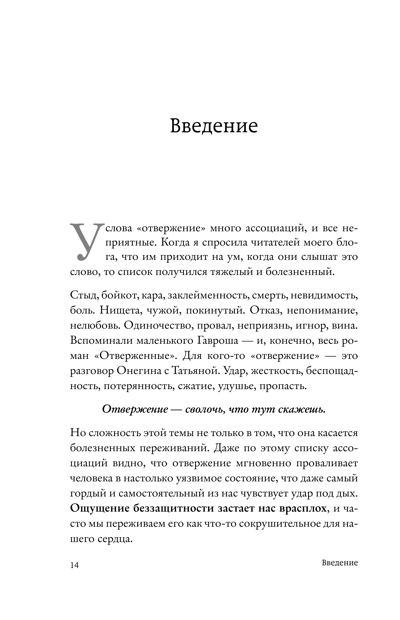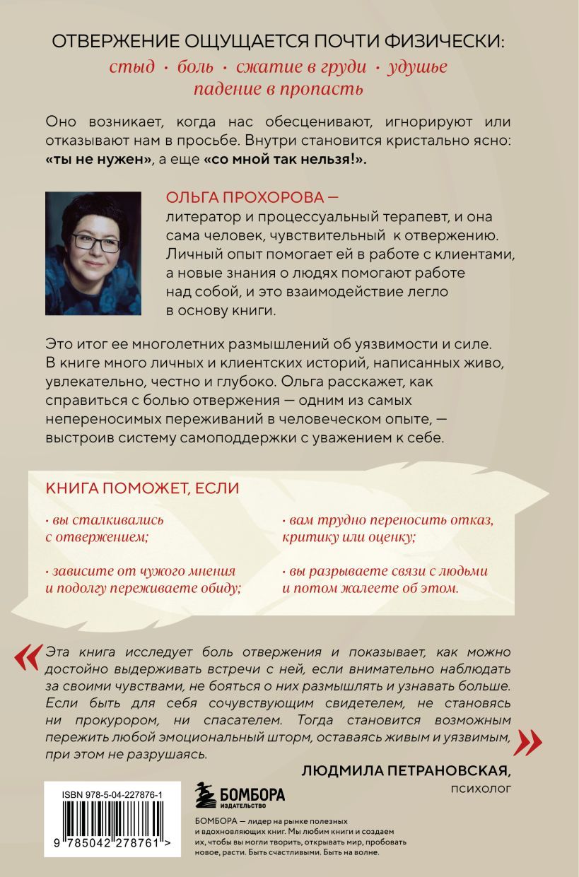 Ольга Прохорова — процессуальный терапевт и литератор, и она сама человек, чувствительный к отвержению. Личный опыт помогает ей в работе с клиентами, а новые знания о людях помогают работе над собой, и это взаимодействие легло в основу книги.