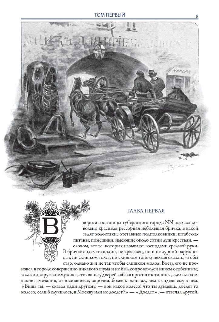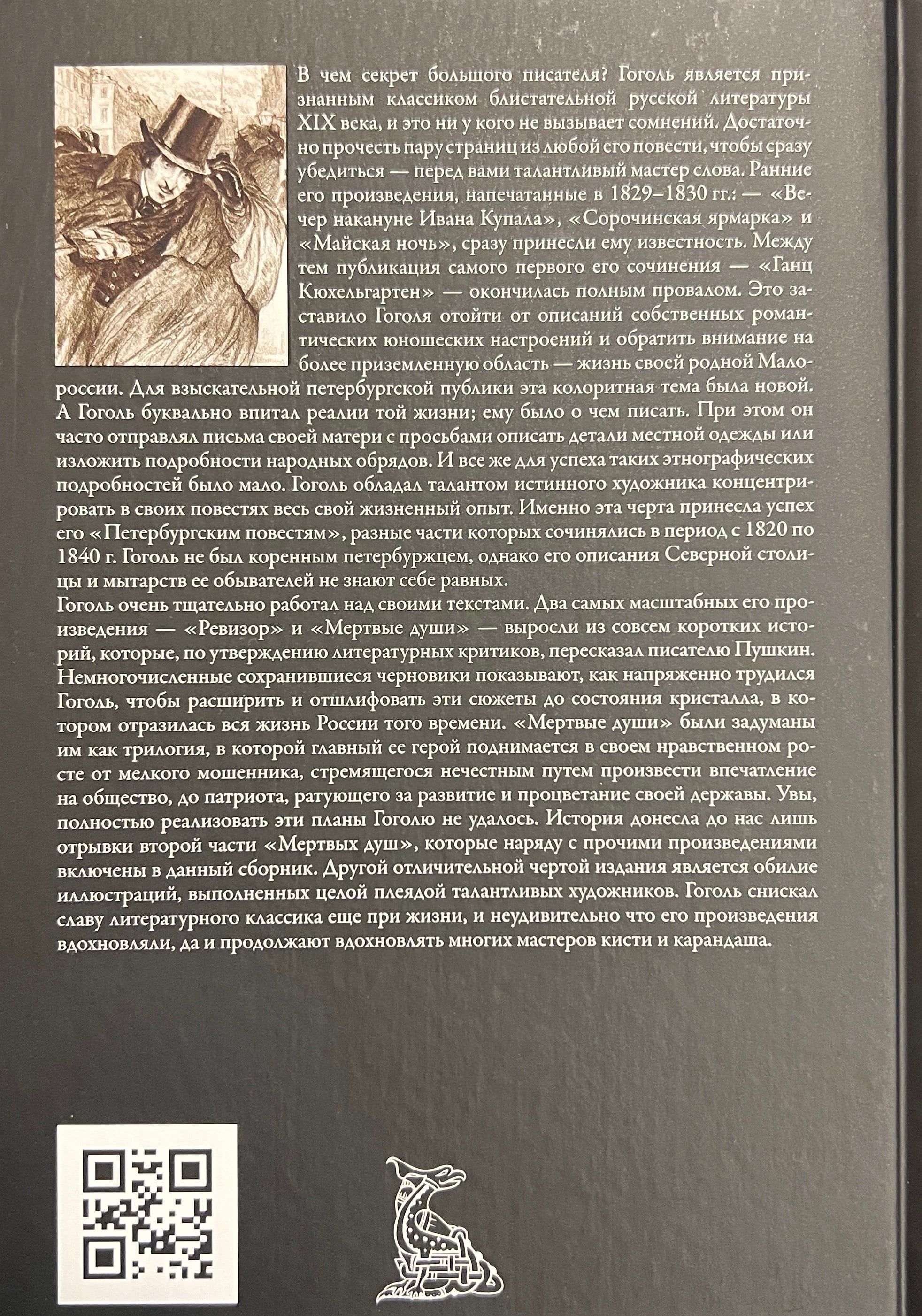 Гоголь очень тщательно работал над своими текстами. Два самых масштабных его произведения — «Ревизор» и «Мертвые души» — выросли из совсем коротких историй, которые, по утверждению литературных критиков, пересказал писателю Пушкин. Немногочисленные сохранившиеся черновики показывают, как напряженно трудился Гоголь, чтобы расширить и отшлифовать эти сюжеты до состояния кристалла, в котором отразилась вся жизнь России того времени. «Мертвые души» были задуманы им как трилогия, в которой главный ее герой поднимается в своем нравственном росте от мелкого мошенника, стремящегося нечестным путем произвести впечатление на общество, до патриота, ратующего за развитие и процветание своей державы. Увы, полностью реализовать эти планы Гоголю не удалось. История донесла до нас лишь отрывки второй части «Мертвых душ», которые наряду с прочими произведениями включены в данный сборник. Другой отличительной чертой издания является обилие иллюстраций, выполненных целой плеядой талантливых художников. Гоголь снискал славу литературного классика еще при жизни, и неудивительно что его произведения вдохновляли, да и продолжают вдохновлять многих мастеров кисти и карандаша.