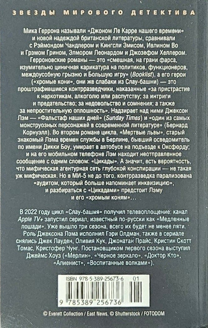 Во втором романе цикла, «Мертвые львы», старый знакомый Лэма времен службы в Берлине, бывший осведомитель по имени Дикки Боу, умирает в автобусе на подъезде к Оксфорду; и мало того что смерть его выглядит подозрительно, но на его мобильном телефоне Лэм находит неотправленное сообщение с одним словом: «Цикады». А значит, есть вероятность, что мифическая агентурная сеть глубокой конспирации — не такая уж мифическая. Но в МИ-5 не до того, контрразведка парализована «аудитом, который больше напоминает инквизицию», и разбираться с «Цикадами» и их мифическим (или все же не мифическим?) руководителем предстоит Лэму и его «хромым коням»... В 2022 году цикл «Слау-башня» получил телевоплощение: канал Apple TV+ запустил сериал, известный по-русски как «Медленные лошади». Уже вышло три сезона, всего их будет не менее пяти. Роль Джексона Лэма исполнил Гэри Олдман, также в сериале снялись Джек Лауден, Оливия Кук, Джонатан Прайс, Кристин Скотт Томас, Кристофер Чунг. Постановщиком первого сезона выступил Джеймс Хоуз («Мерлин», «Черное зеркало», «Доктор Кто», «Алиенист», «Воспитанные волками»).