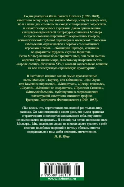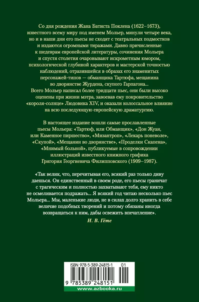 В настоящее издание вошли самые прославленные пьесы Мольера: «Тартюф, или Обманщик», «Дон Жуан, или Каменное пиршество», «Мизантроп», «Лекарь поневоле», «Скупой», «Мещанин во дворянстве», «Проделки Скапена», «Мнимый больной», публикуемые в сопровождении иллюстраций известного книжного графика Григория Георгиевича Филипповского (1909–1987).