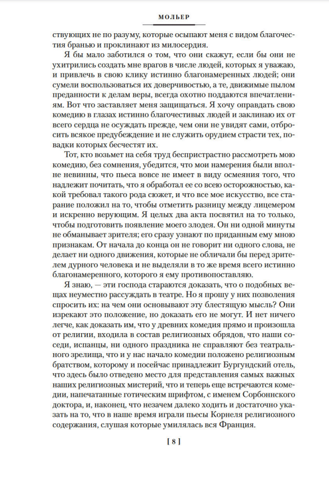 Со дня рождения Жана Батиста Поклена (1622–1673), известного всему миру под именем Мольер, минули четыре века, но и в наши дни его пьесы не сходят с театральных подмостков и издаются огромными тиражами. Давно причисленные к шедеврам европейской литературы, сочинения Мольера и спустя столетия очаровывают искрометным юмором, психологической глубиной характеров и мастерской точностью наблюдений, отразившейся в образах его знаменитых персонажей-типов — обманщика Тартюфа, мещанина во дворянстве Журдена, скупого Гарпагона... Всего Мольер написал более тридцати пьес, они были высоко оценены при жизни мэтра, завоевав ему покровительство «короля-солнце» Людовика XIV, и оказали колоссальное влияние на всю последующую европейскую драматургию.