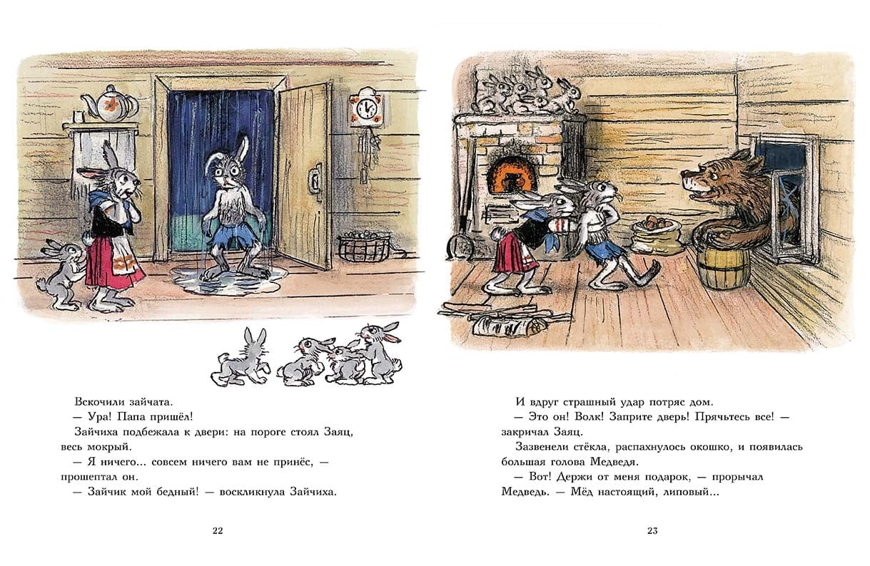 Когда несчастный, промокший и уставший Заяц вернулся домой с пустыми лапами, его сытые детишки уже спали. И тут напоследок, всех напугав громким стуком, появился медведь с бочонком меда в благодарность за яблоки.