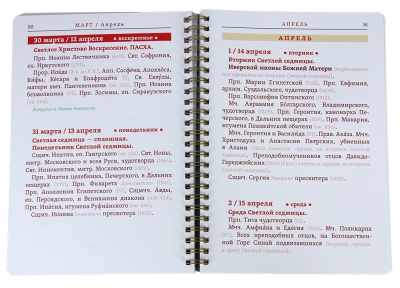 Фамилии новомучеников и исповедников Церкви Русской, указания века или года кончины святого, а также информация о переходящих празднованиях даны приглушенным цветом, чтобы глаз в первую очередь «выхватывал» из текста именования святых. Над сложными и непривычными именами проставлены ударения.