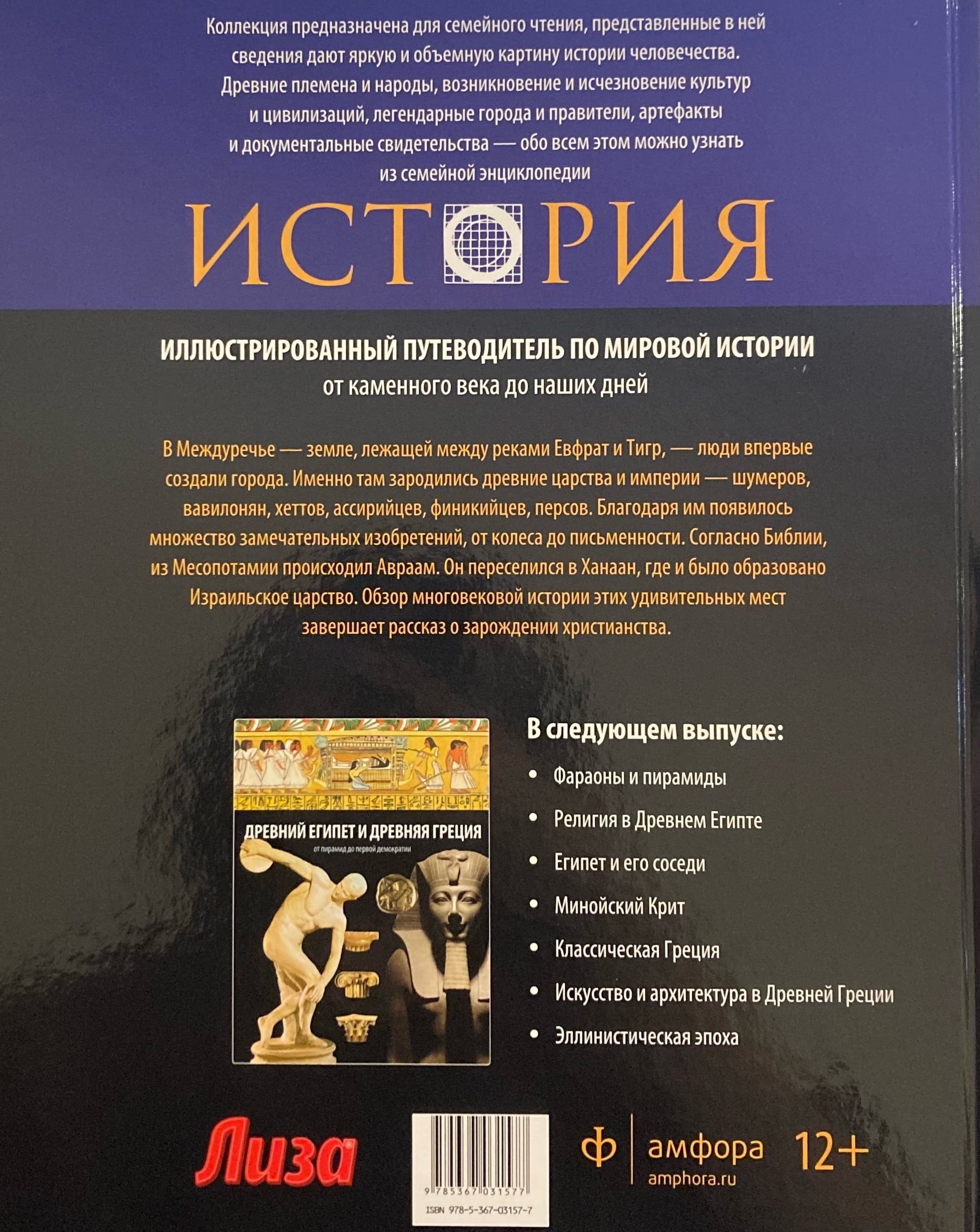 В Междуречье - земле, лежащей между реками Евфрат и Тигр, - люди впервые создали города. Именно там зародились древние царства и империи - шумеров, вавилонян, хеттов, ассирийцев, финикийцев, персов. Благодаря им появилось множество замечательных изобретений, от колеса до письменности. Согласно Библии, из Месопатамии происходил Авраам. Он переселился в Ханаан, где и было образовано Израильское царство. Обзор многовековой истории этих удивительных мест завершает рассказ о зарождении христианства.