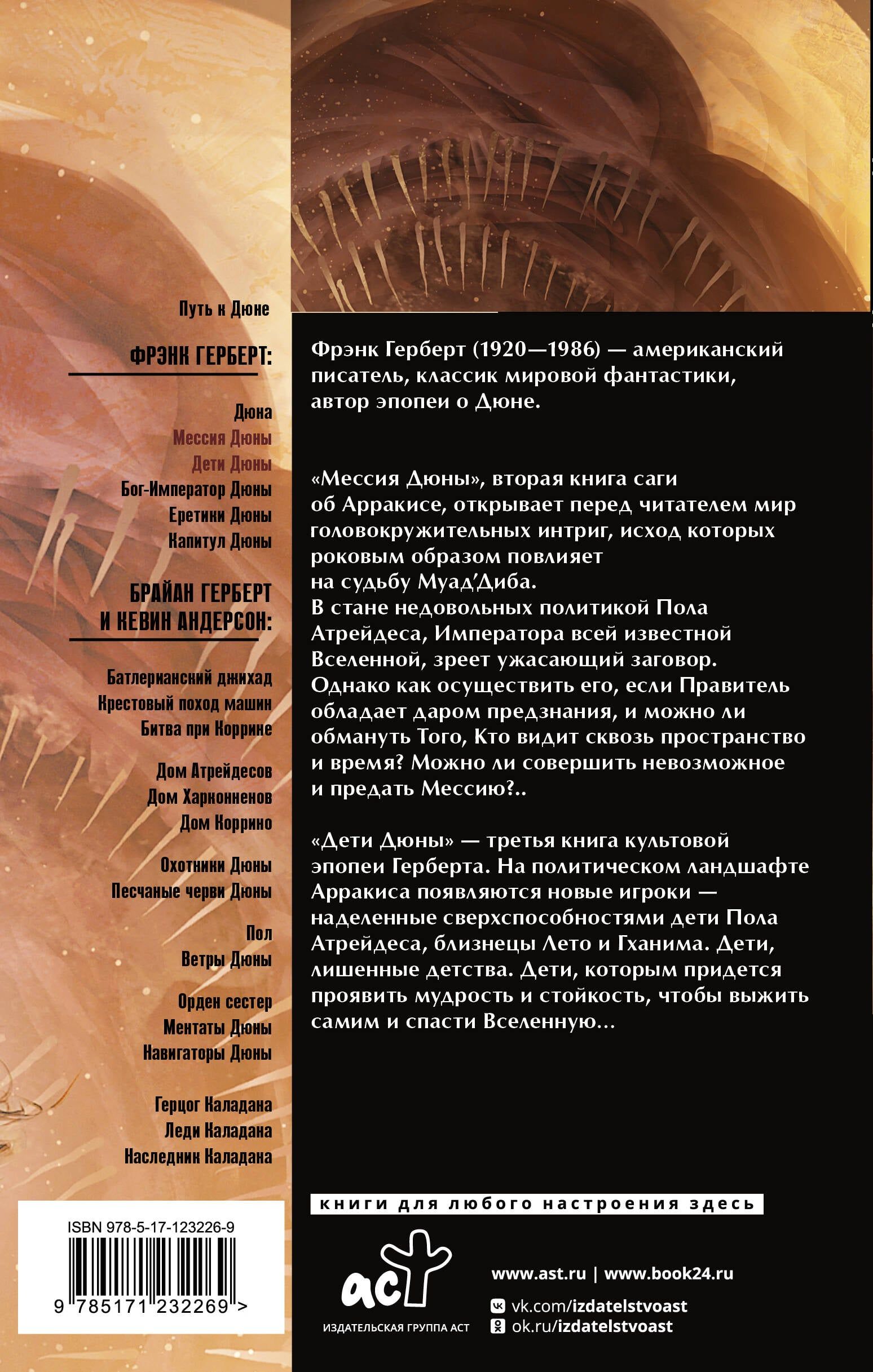 «Мессия Дюны», вторая книга саги об Арракисе, открывает перед читателем мир головокружительных интриг, исход которых роковым образом повлияет на судьбу Муад’Диба. В стане недовольных политикой Пола Атрейдеса, Императора всей известной Вселенной, зреет ужасающий заговор. Однако как осуществить его, если Правитель обладает даром предзнания, и можно ли обмануть Того, Кто видит сквозь пространство и время? Можно ли совершить невозможное и предать Мессию?.. «Дети Дюны» – третья книга культовой эпопеи Герберта. На политическом ландшафте Арракиса появляются новые игроки – наделенные сверхспособностями дети Пола Атрейдеса, близнецы Лето и Гханима. Дети, лишенные детства. Дети, которым придется проявить мудрость и стойкость, чтобы выжить самим и спасти Вселенную…