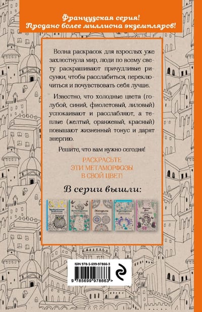 "Метаморфозы" – это бесконечные причудливые превращения занкомых нам существ и предметов друг в друга. Раскрасьте этих необычных созданий в яркие цвета. Не бойтесь творить и экспериментировать!