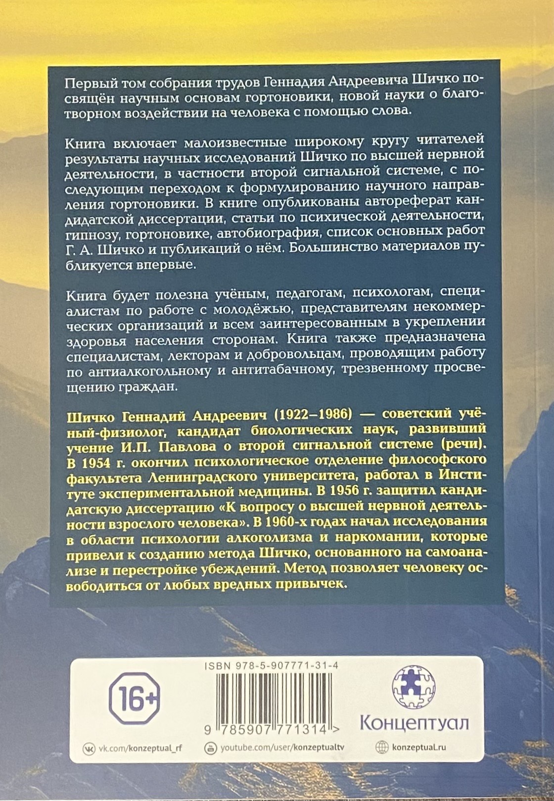 Первый том собрания трудов Геннадия Андреевича Шичко посвящён научным основам гортоновики, новой науки о благотворном воздействии на человека с помощью слова. Книга включает малоизвестные широкому кругу читателей результаты научных исследований Шичко по высшей нервной деятельности, в частности второй сигнальной системе, с последующим переходом к формулированию научного направления гортоновики. В книге опубликованы автореферат кандидатской диссертации, статьи по психической деятельности, гипнозу, гортоновике, автобиография, список основных работ Г. А. Шичко и публикаций о нём. Большинство материалов публикуется впервые.