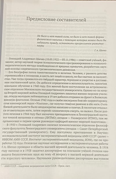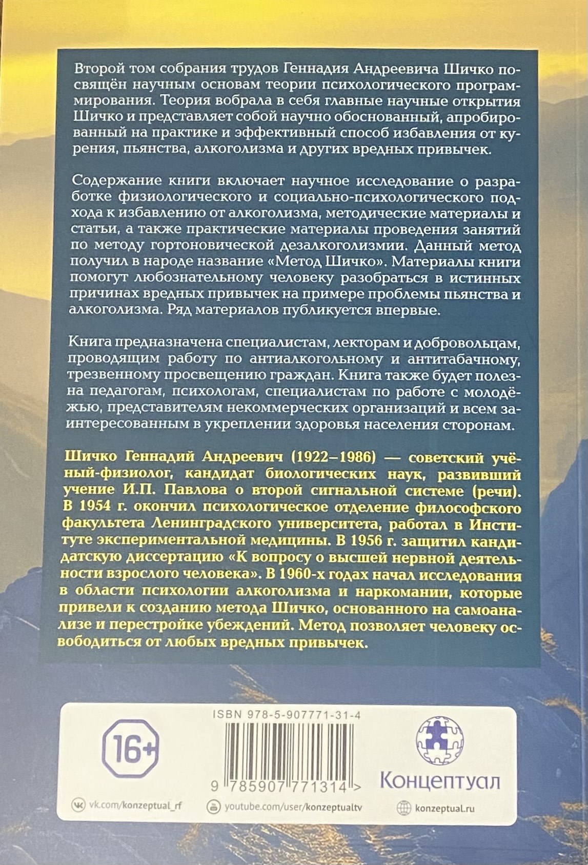Второй том собрания трудов Геннадия Андреевича Шичко посвящён научным основам теории психологического программирования. Теория вобрала в себя главные научные открытия Шичко и представляет собой научно обоснованный, апробированный на практике и эффективный способ избавления от курения, пьянства, алкоголизма и других вредных привычек. Содержание книги включает научное исследование о разработке физиологического и социально-психологического подхода к избавлению от алкоголизма, методические материалы и статьи, а также практические материалы проведения занятий по методу гортоновической дезалкоголизмии. Данный метод получил в народе название «Метод Шичко». Комплект будет полезен учёным, педагогам, психологам, специалистам по работе с молодёжью, представителям некоммерческих организаций и всем заинтересованным в укреплении здоровья населения сторонам. Книги также предназначены специалистам, лекторам и добровольцам, проводящим работу по антиалкогольному и антитабачному, трезвенному просвещению граждан.