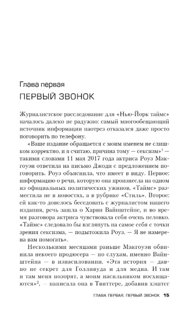 Несколько месяцев Вайнштейн стремился помешать расследованию, нанимая юристов и шпионов, саботировавших работу журналисток. Драматическое противостояние продюсера и газеты закончилось публикацией знаменитой статьи «Нью-Йорк Таймс», которая произвела эффект разорвавшейся бомбы и впоследствии была отмечена Пулитцеровской премией 2018 года. Моментально ставшая классикой журналистского расследования, эта книга в детективной манере рассказывает не только историю расследования и его последствия для движения #MeToo, но и вдохновляющие истории женщин, которые рискнули рассказать о своем травматичном опыте — ради других женщин, для будущих поколений и для себя самих.