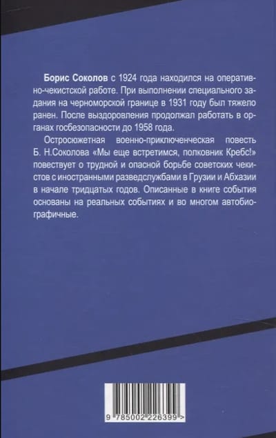 Остросюжетная военно-приключенческая повесть Б.Н. Соколова «Мы еще встретимся, полковник Кребс!» повествует о трудной и опасной борьбе советских чекистов с иностранными разведслужбами в Грузии и Абхазии в начале тридцатых годов. Описанные в книге события основаны на реальных событиях и во многом автобиографичные.