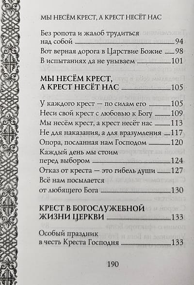 Все мы, хотим мы этого или не хотим, нравится нам это на не нравится, несём свои жизненные кресты. У каждого кресты свои это старость и болезни, бедность и одиночество, семей ные неурядицы, духовные испытания. Крест, который Госць даёт нам нести в своей жизни, у каждого по силам его. Тіз, что мы можем потерпеть, то и даётся нам. Если человек без ропота уныния принимает жизненные обстоятельства такими, како есть, значит, он свой крест берёт. И тогда Сам Господь невя мой рукой будет поддерживать и помогать его нести, даст ова не считать трудные обстоятельства жизни безысходными. Та что мы несём крест, а крест несёт нас. Дай Бог, чтобы он довес нас до всеславной, вселикующей, всерадостной жизни в Цар Небесном!