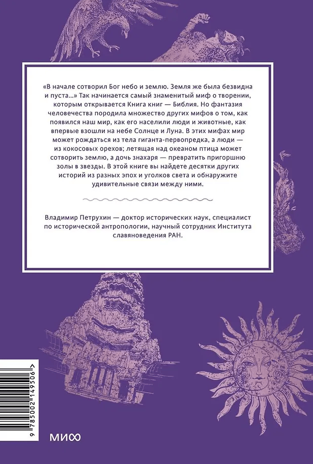 Новая книга Владимира Петрухина — это потрясающий экскурс в космогонии десятков культур, как древнейших, так и современных: от Шумера и Вавилона до Индии и Скандинавии, от Библии до северных шаманов. Вы узнаете множество неожиданных деталей знакомых мифов, познакомитесь с новыми, о которых могли и не слышать, и увидите потрясающие пересечения между несхожими мифологиями.