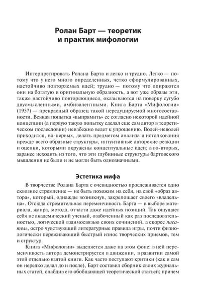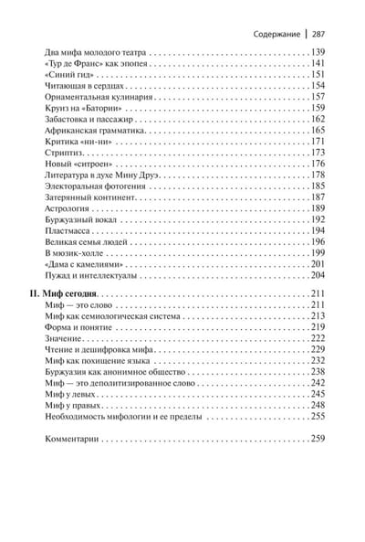 Серия очерков «Мифологии» представляет собой блестящий анализ массовой культуры как знаковой системы. Автор семиотически объясняет механизм появления политических мифов как превращение истории в идеологию при условии знакового оформления этого процесса. В обобщающей части работы — статье «Миф сегодня» предлагается и объяснение, и метод противостояния современному мифологизированию — создание новейшего искусственного мифа, конструирование условного, третьего уровня мифологии, если под первым понимать архаико-традиционную, под вторым — «новую» (как научный класс, например, советскую). В исследованиях Р. Барта ведущим определением мифа является слово. Все, что покрывается дискурсом, может стать мифом, так как «наш мир бесконечно суггестивен». Миф, по Барту, является маркирующей качественной характеристикой «анонимного» современного буржуазного общества, при этом мифологизация рассматривается как признак всех социумов.