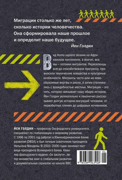На протяжении истории люди мигрировали: осваивали новые континенты, завоевывали другие государства, бежали от войн и климатических изменений. Политика и дипломатия, торговля и культурный обмен, инновации и глобализация — все это было бы немыслимо без долгой истории человеческих миграций. Оксфордский профессор Йен Голдин убежден: миграция — это залог выживания нашего вида и движущая сила человеческого прогресса. Почему наши древнейшие предки покинули Африку? Как экспансия викингов изменила Европу? Какие последствия несет массовая миграция и как приумножить ее положительные эффекты? И почему в современном мире свобода передвижения сменилась чередой непроницаемых барьеров — государственных границ, виз и паспортов? Основанная на археологических материалах и современных генетических исследованиях, эта проницательная книга знакомит нас с богатой и удивительной историей мигрантов прошлого и настоящего.