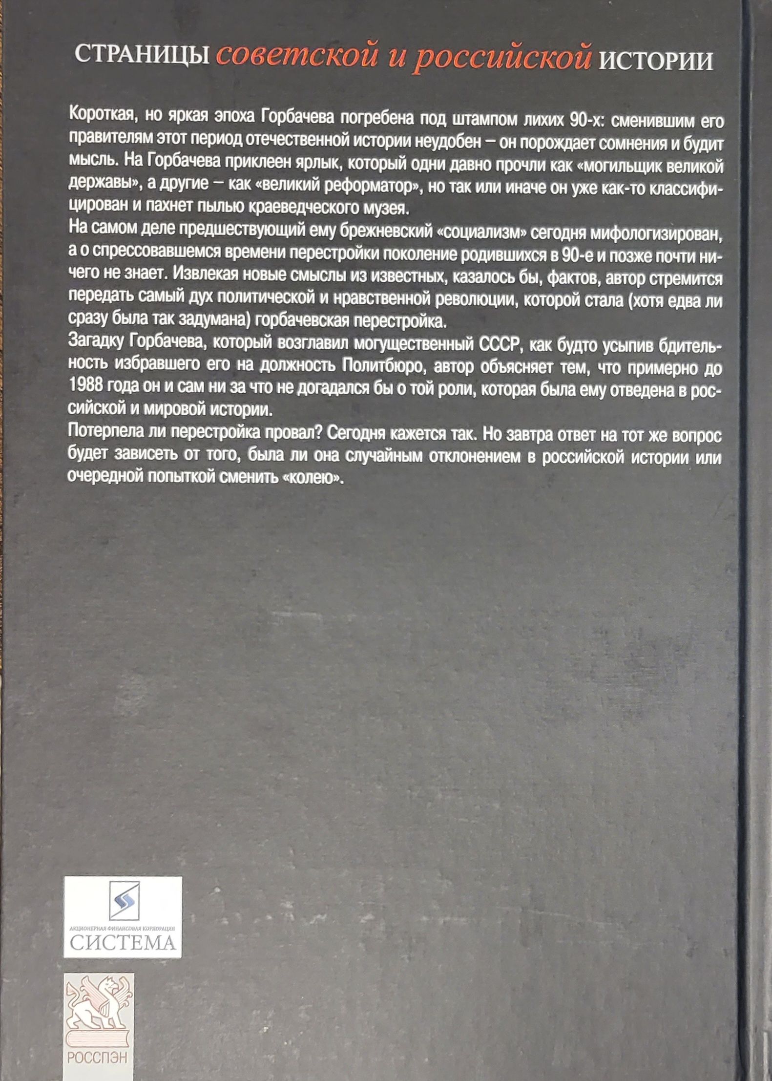 Короткая, но яркая эпоха Горбачева погребена под штампом лихих 90-х: сменившим его правителям этот период отечественной истории неудобен – он порождает сомнения и будит мысль. На Горбачева приклеен ярлык, который одни давно прочли как «могильщик великой державы», а другие – как «великий реформатор», но так или иначе он уже как-то классифицирован и пахнет пылью краеведческого музея. На самом деле предшествующий ему брежневский «социализм» сегодня мифологизирован, а о спрессовавшемся времени перестройки поколение родившихся в 90-е и позже почти ничего не знает. Извлекая новые смыслы из известных, казалось бы, фактов, автор стремится передать самый дух политической и нравственной революции, которой стала (хотя едва ли сразу была так задумана) горбачевская перестройка. Загадку Горбачева, который возглавил могущественный СССР, как будто усыпив бдительность избравшего его на должность Политбюро, автор объясняет тем, что примерно до 1988 года он и сам ни за что не догадался бы о той роли, которая была ему отведена в российской и мировой истории. Потерпела ли перестройка провал? Сегодня кажется так. Но завтра ответ на тот же вопрос будет зависеть от того, была ли она случайным отклонением в российской истории, или очередной попыткой сменить «колею».