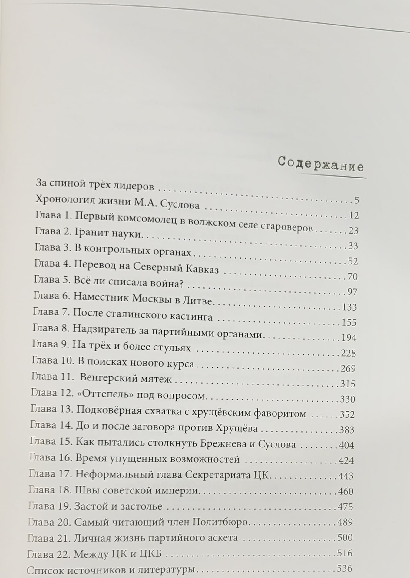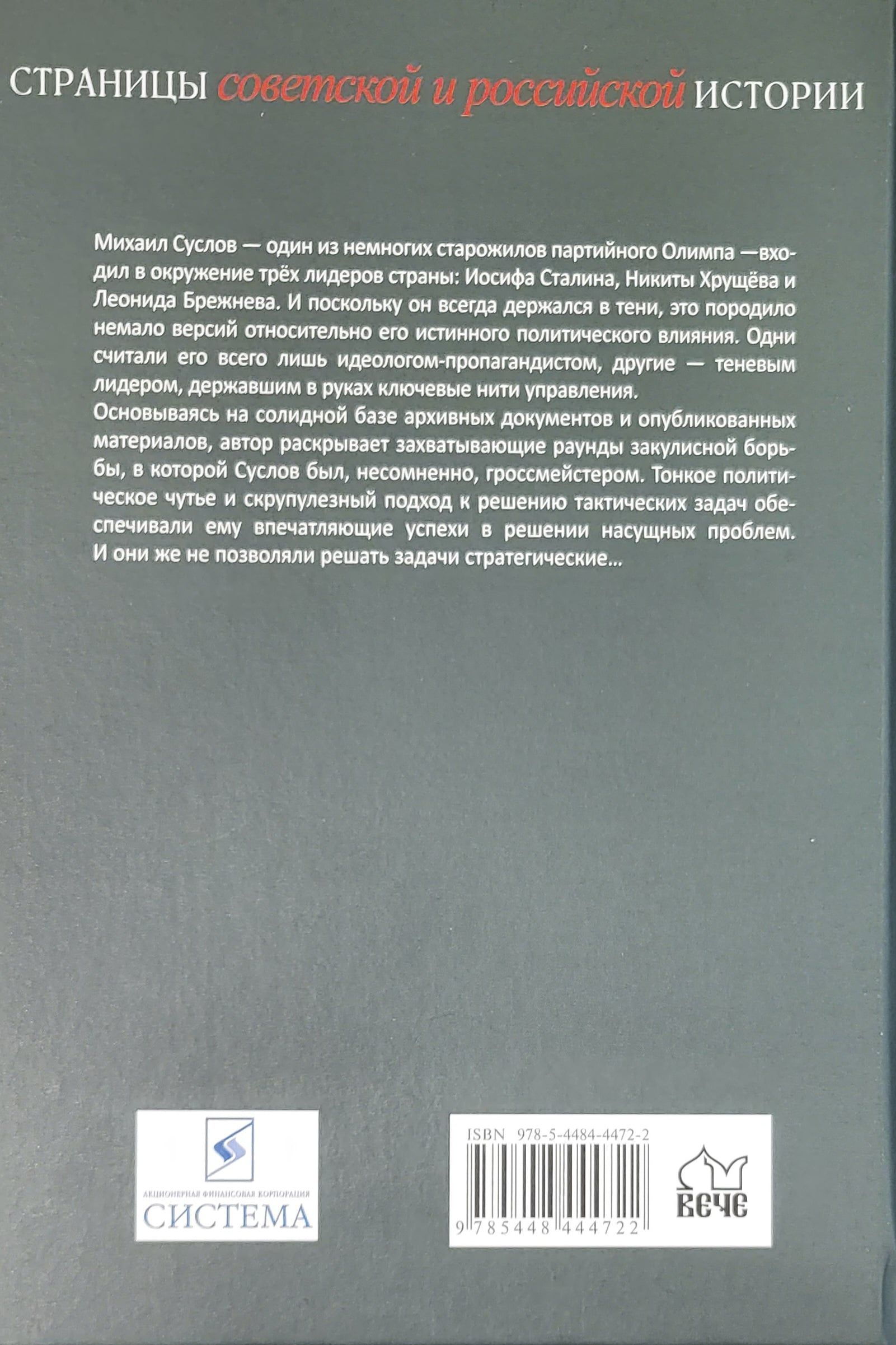 Михаил Суслов — один из немногих старожилов партийного Олимпа — входил в окружение трех лидеров страны: Иосифа Сталина, Никиты Хрущева, и Леонида Брежнева. И поскольку он всегда держался в тени, это породило немало версий относительно его истинного политического влияния. Одни считали его всего лишь идеологом-пропагандистом, другие — теневым лидером, державшим в руках ключевые нити управления. Основываясь на солидной базе архивных документов и опубликованных материалов, автор раскрывает захватывающие раунды закулисной борьбы, в которой Суслов был, несомненно, гроссмейстером. Тонкое политическое чутье и скрупулезный подход к решению тактических задач обеспечивали ему успехи в решении насущных проблем. И они же не позволяли решить задачи стратегические…