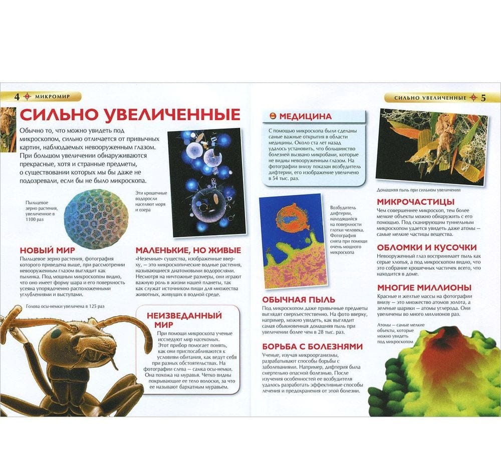 Читателя этой книги ждут удивительные открытия: в ней рассказывается о том, что невозможно увидеть невооруженным глазом, о микромире, где каждый предмет таит в себе неожиданность. Под микроскопом крохотные существа превращаются в страшных монстров, привычные вещи меняют свой облик, и даже о собственной коже, волосах, одежде можно узнать много нового и интересного. Все это вы увидите на подробных фотографиях, сделанных при большом увеличении. Книга рассказывает и о том, как устроен микроскоп, какие бывают микроскопы, для чего их применяют, и как можно приготовить препараты для микроскопии.