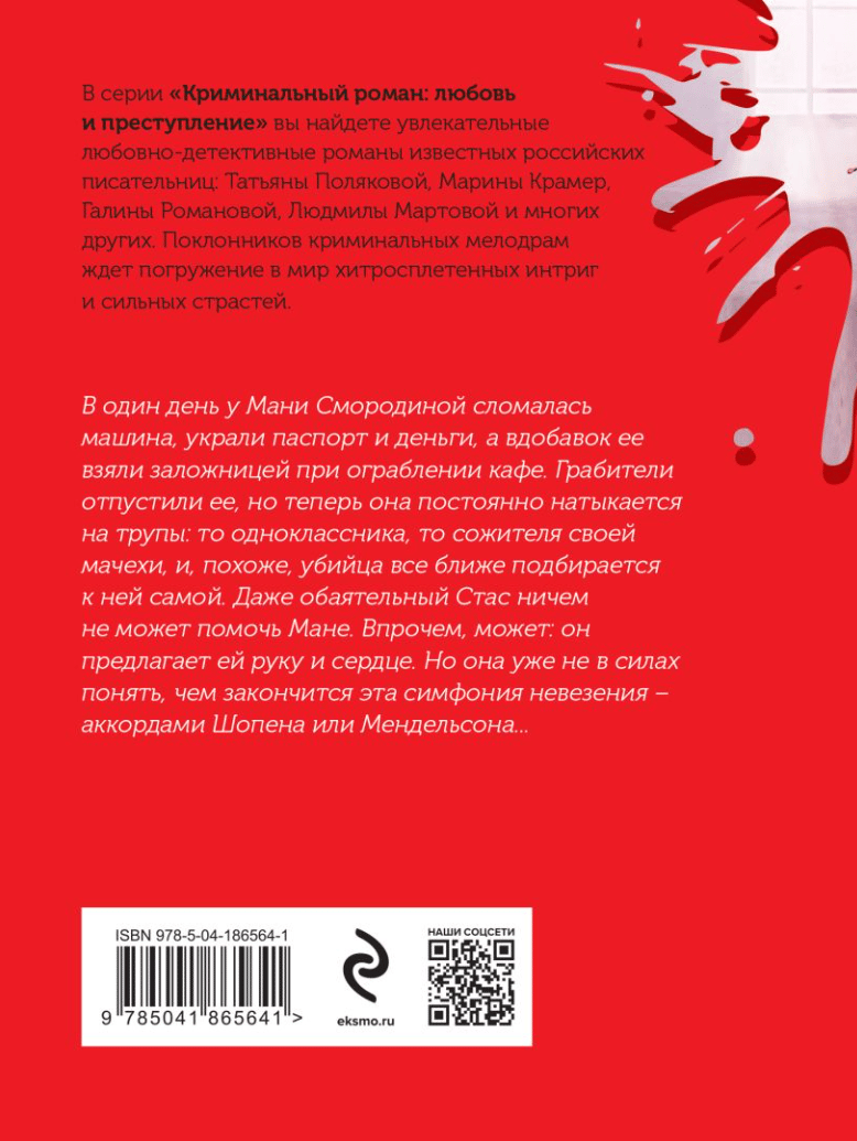 В один день у Мани Смородиной сломалась машина, украли паспорт и деньги, а вдобавок ее взяли заложницей при ограблении кафе. Грабители отпустили ее, но теперь она постоянно натыкается на трупы: то одноклассника, то сожителя своей мачехи, и, похоже, убийца все ближе подбирается к ней самой. Даже обаятельный Стас ничем не может помочь Мане. Впрочем, может: он предлагает ей руку и сердце. Но она уже не в силах понять, чем закончится эта симфония невезения — аккордами Шопена или Мендельсона...