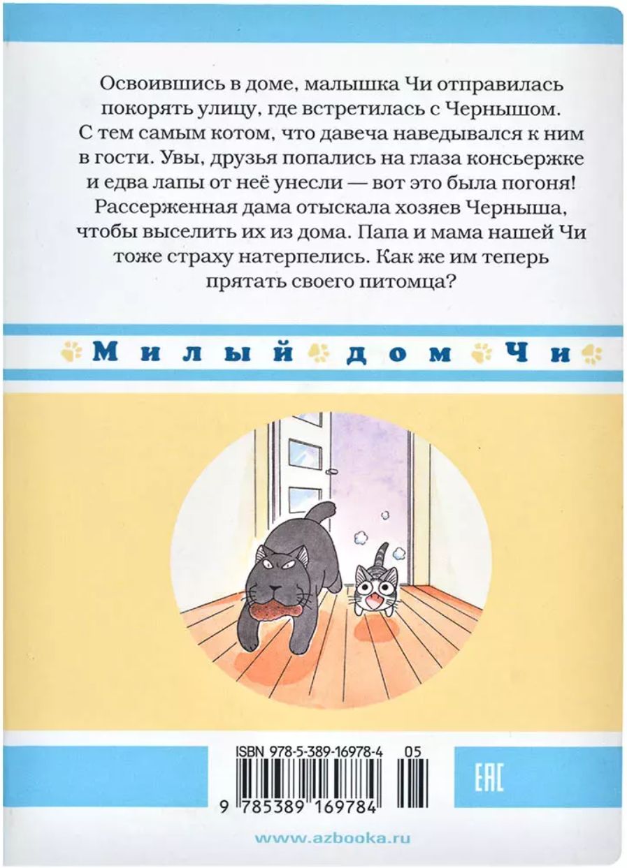 Освоившись в доме, малышка Чи отправилась покорять улицу, где встретила огромного кота по кличке Черныш. Того самого, что давеча наведывался к ним в гости. Во время своей вылазки друзья попались на глаза строгой консьержке и едва лапы от неё унесли – вот это была погоня! Увы, рассерженная дама не оставила Черныша в покое. Она решила во что бы то ни стало выселить его хозяев из дома. Папа и мама нашей Чи тоже страху натерпелись. Как же им и теперь прятать питомца, если он так и норовит выбраться во двор на поиски приключений?