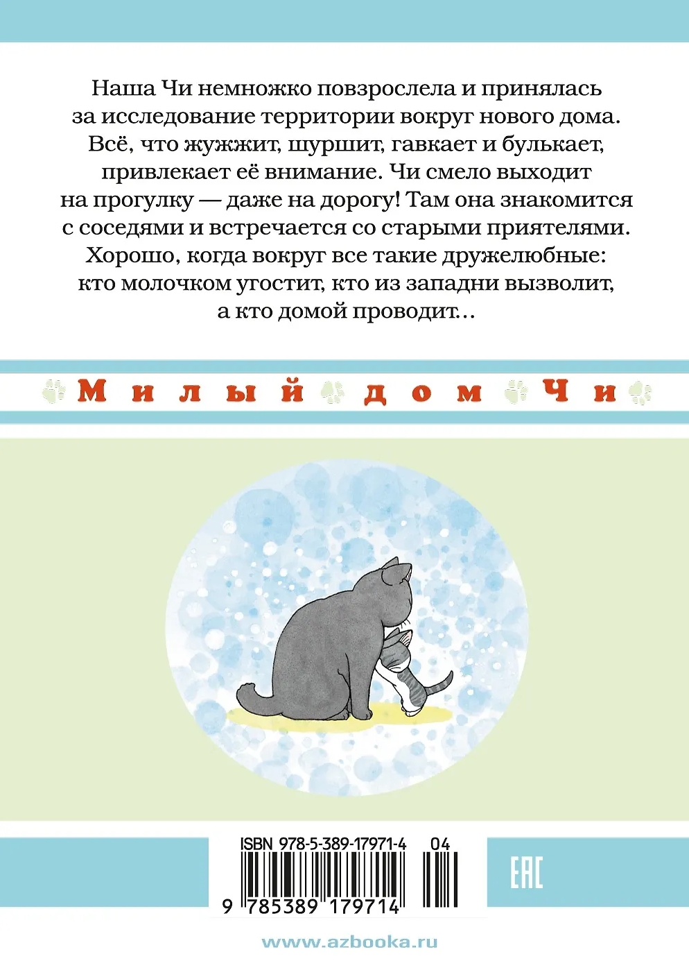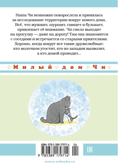 Наша Чи немножко повзрослела и принялась за исследование территории вокруг нового дома. Все, что жужжит, шуршит, гавкает и булькает – привлекает ее внимание. Чи смело выходит на прогулку – даже на дорогу! Там она знакомится с соседями и встречается со старыми приятелями. Хорошо, когда вокруг все такие дружелюбные: кто молочком угостит, кто из западни вызволит, а кто домой проводит...