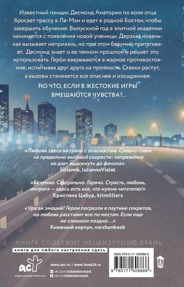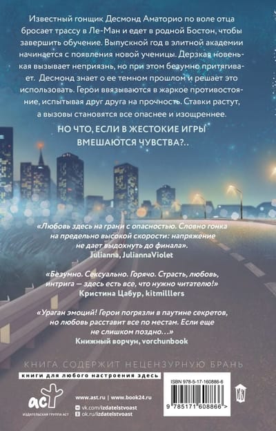Известный гонщик Десмонд Аматорио по воле отца бросает трассу в Ле-Ман и едет в родной Бостон, чтобы завершить обучение. Выпускной год в элитной академии начинается с появления новой ученицы. Дерзкая новенькая вызывает неприязнь, но при этом безумно притягивает. Десмонд знает о ее темном прошлом и решает это использовать. Герои ввязываются в жаркое противостояние, испытывая друг друга на прочность. Ставки растут, а вызовы становятся все опаснее и изощреннее. Но что, если в жестокие игры вмешаются чувства?..