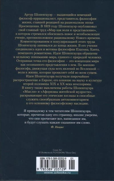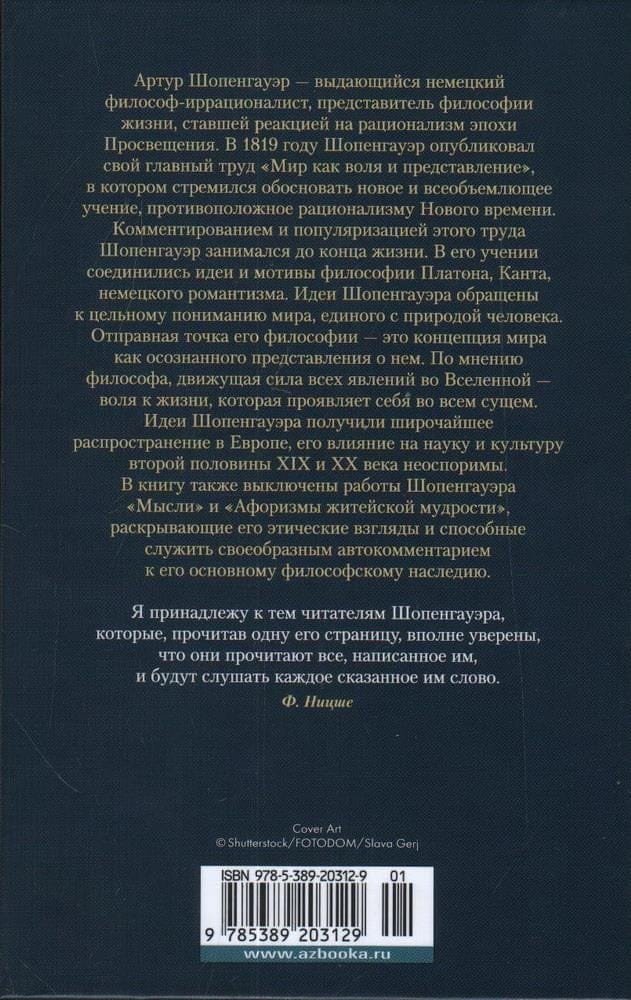 Артур Шопенгауэр — выдающийся немецкий философ-иррационалист, представитель философии жизни, ставшей реакцией на рационализм эпохи Просвещения. В 1819 году Шопенгауэр опубликовал свой главный труд «Мир как воля и представление», в котором стремился обосновать новое и всеобъемлющее учение, противоположное рационализму Нового времени. Комментированием и популяризацией этого труда Шопенгауэр занимался до конца жизни. В его учении соединились идеи и мотивы философии Платона, Канта, немецкого романтизма. Идеи Шопенгауэра обращены к цельному пониманию мира, единого с природой человека. Отправная точка его философии — это концепция мира как осознанного представления о нем. По мнению философа, движущая сила всех явлений во Вселенной — воля к жизни, которая проявляет себя во всем сущем. Идеи Шопенгауэра получили широчайшее распространение в Европе, его влияние на науку и культуру второй половины XIX и ХХ века неоспоримы. В книгу также включены работы Шопенгауэра «Мысли» и «Афоризмы житейской мудрости», раскрывающие его этические взгляды и способные служить своеобразным автокомментарием к его основному философскому наследию.