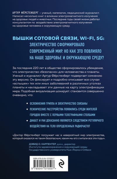 Вышки сотовой связи, километры проводов, wi-fi и мобильные телефоны сформировали наш современный мир. Мы просто не можем себе представить жизнь без электронных средств связи: телевидения, радио, планшетов и ноутбуков. А ведь всего 130 лет назад их не было. Автор проводит расследование того, как электромагнитное загрязнение повлияло на наше здоровье и здоровье планеты в целом. Фактически, он наложил карту вспышек заболеваний по всему миру на карту электрификации. И знаете что? Они совпали! Шокирующее исследование от мирового ученого изменит ваше представление о безопасных сотовых и микроволновках.