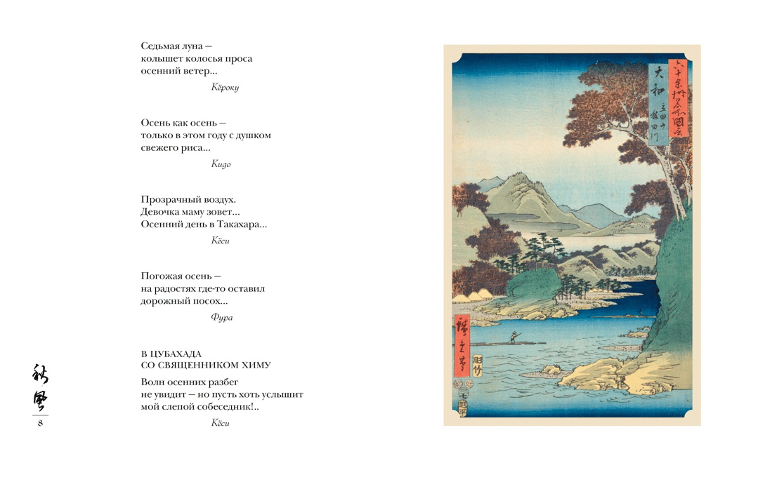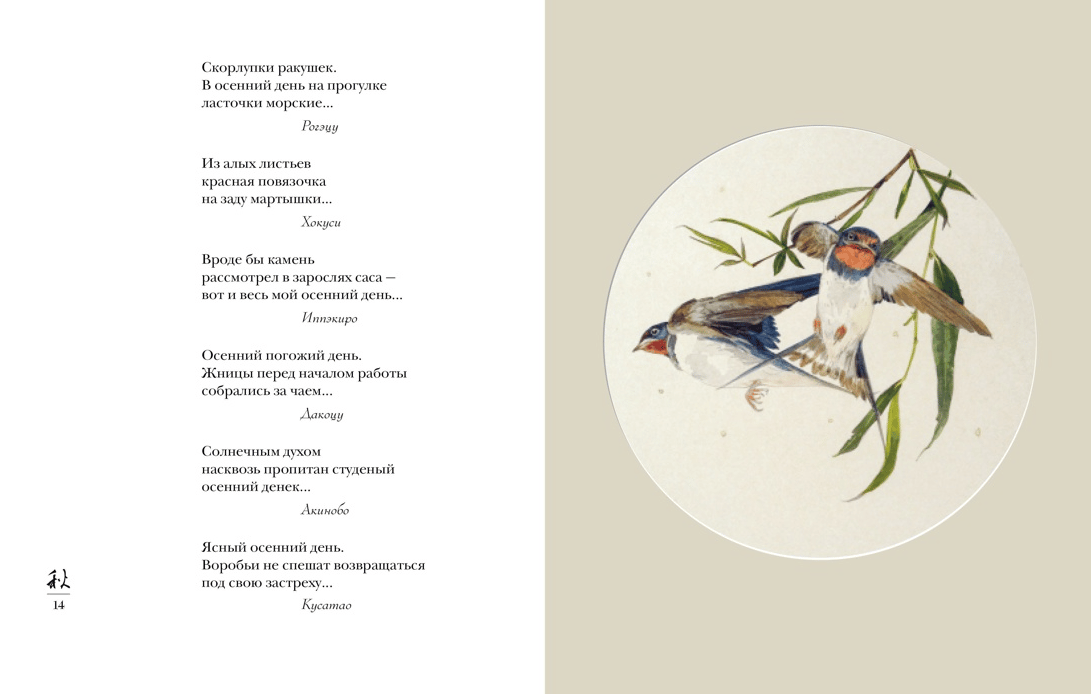 Утонченная и немногословная японская поэзия хайку всегда была отражением мира природы, воплощенного в бесконечной смене времен года. Человек, живущий обыденной жизнью, чьи пять чувств настроены на постоянное восприятие красоты земли и неба, цветов и трав, песен цикад и солнечного тепла, — вот лирический герой жанра, объединяющего поэзию, живопись и каллиграфию. Авторы хайку создали своего рода поэтический календарь, в котором отводилось место для разнообразных растений и животных, насекомых, птиц и рыб, для бытовых зарисовок и праздников.