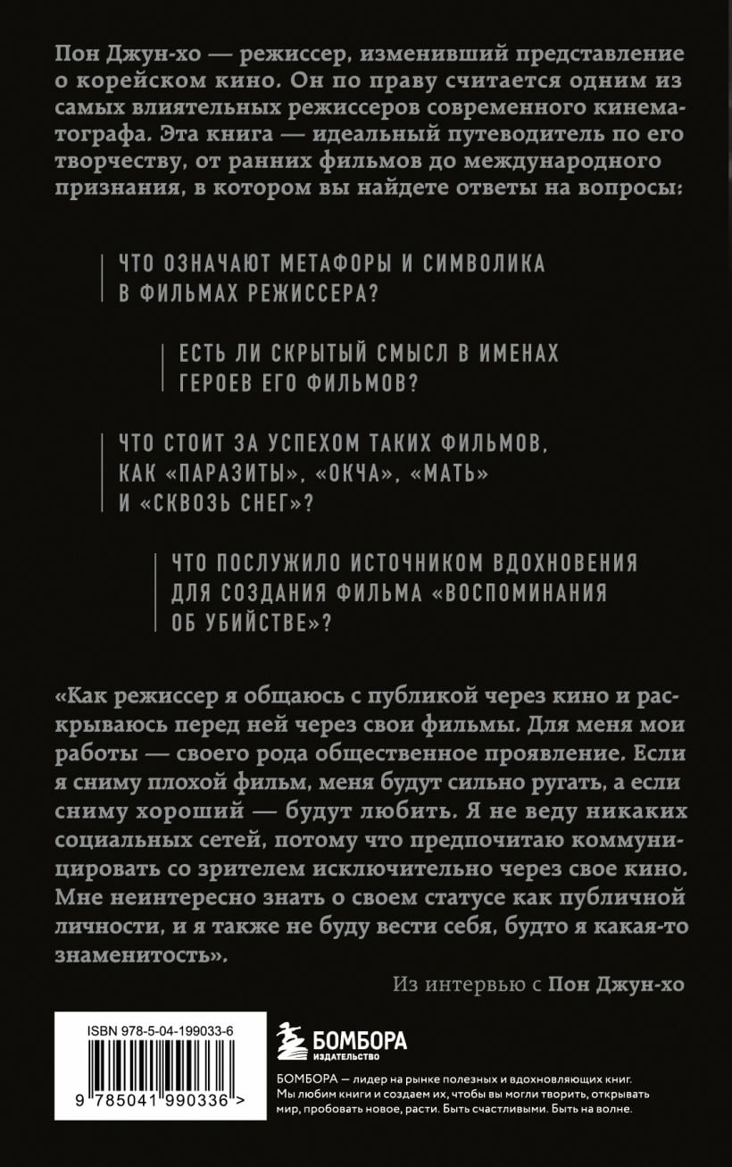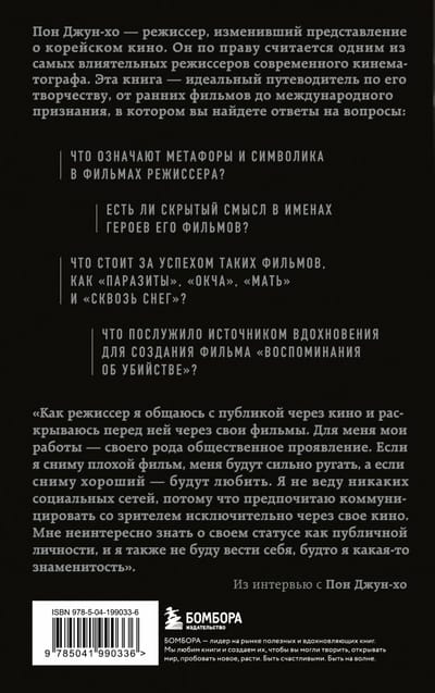 Пон Джун-хо — режиссер, изменивший представление о корейском кино. В своей книге корейский кинокритик Ли Дон-чжин анализирует ключевые работы Пон Джун-хо, а также беседует о жизни и творчестве с самим режиссером! От ранних фильмов до международного признания.