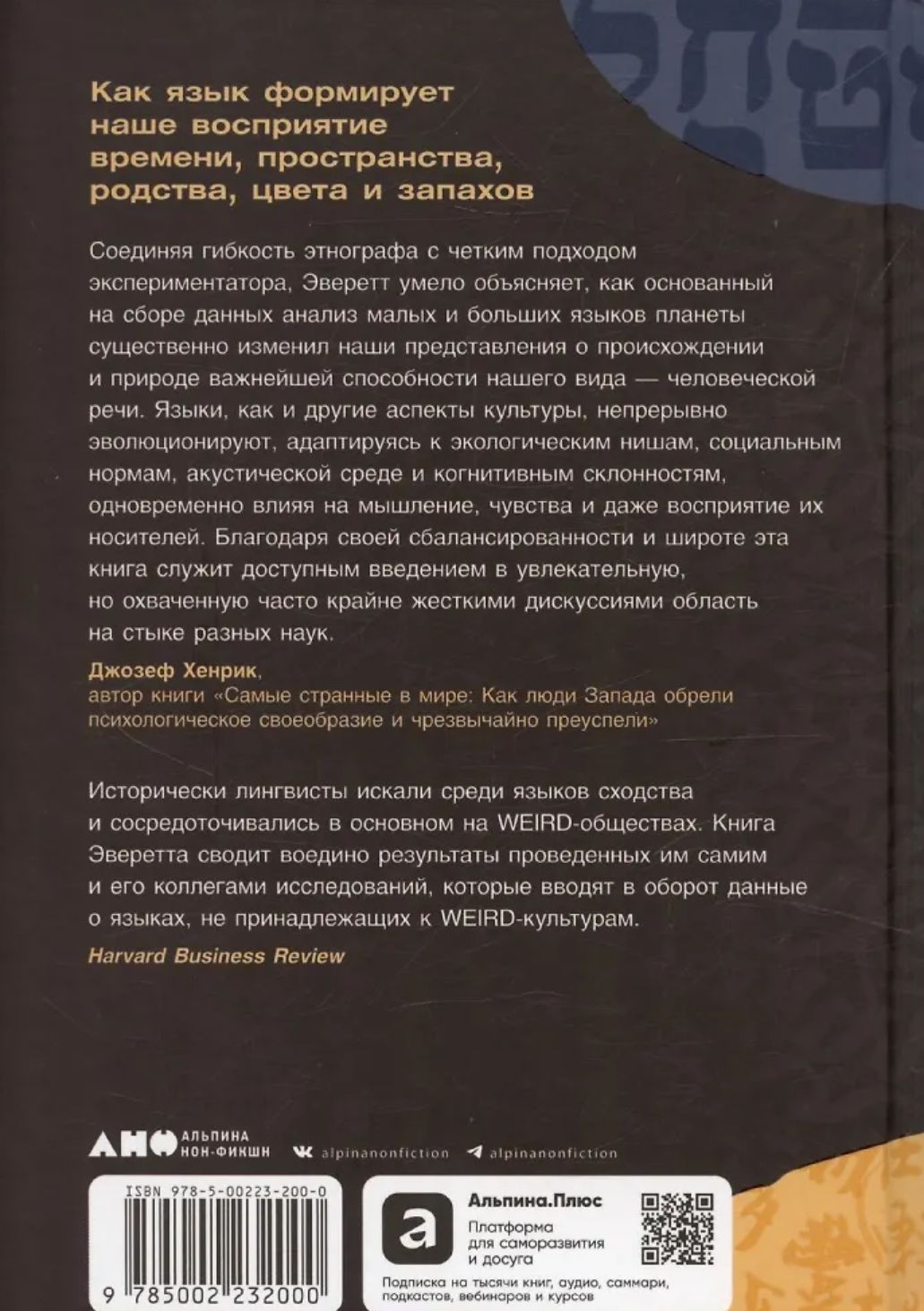 Эверетт сочетает научную точность и доступность изложения: сложные концепции иллюстрируются яркими примерами из разных языков мира. Главная ценность книги в том, что она обобщает новейшие открытия в лингвистике, многие из которых были сделаны при изучении редких языков малых народов. Здесь представлен свежий взгляд на фундаментальные вопросы о природе языка и человеческого познания.