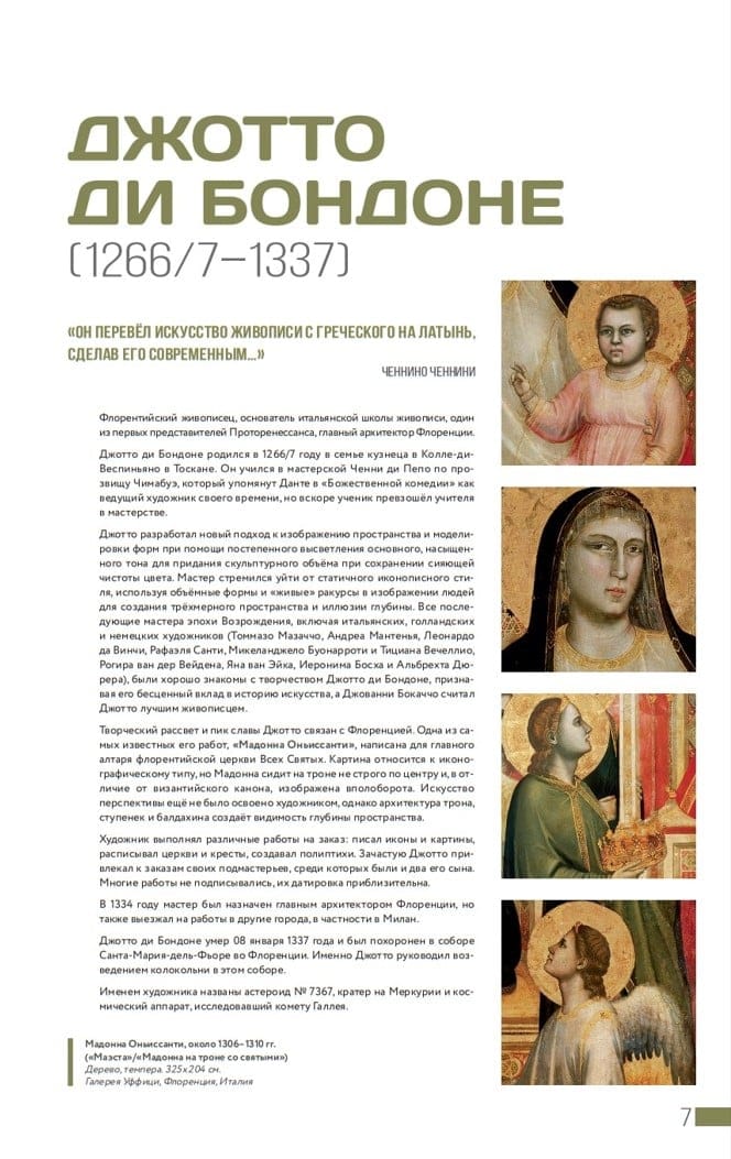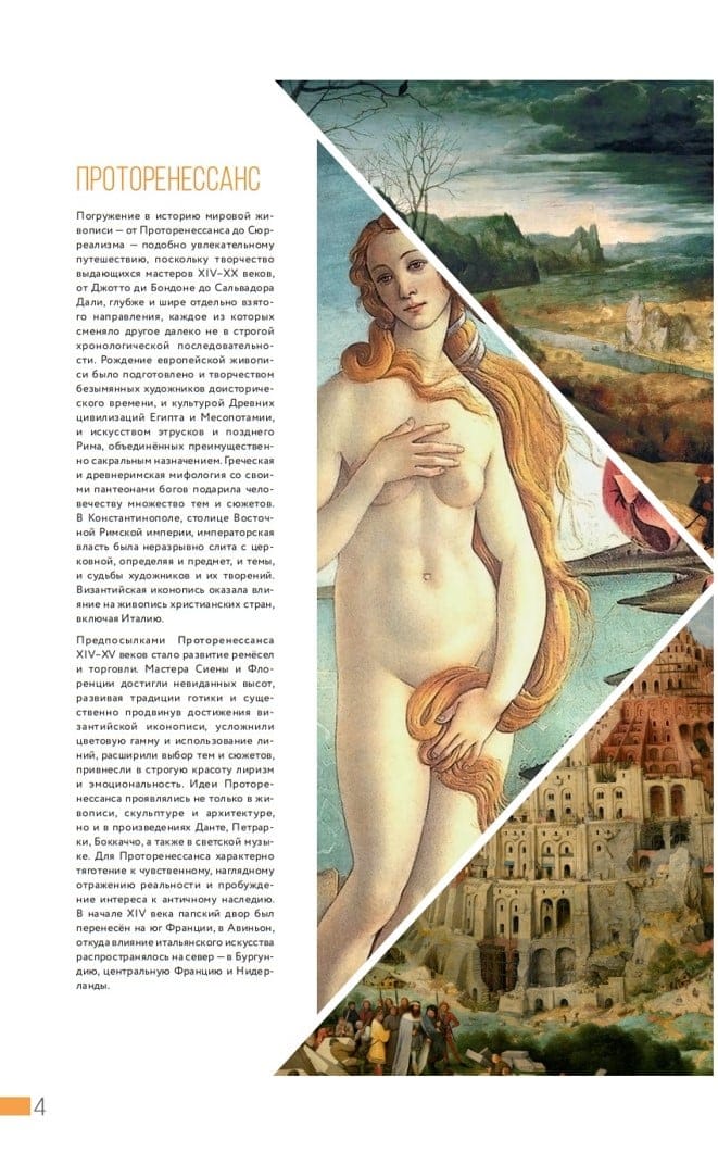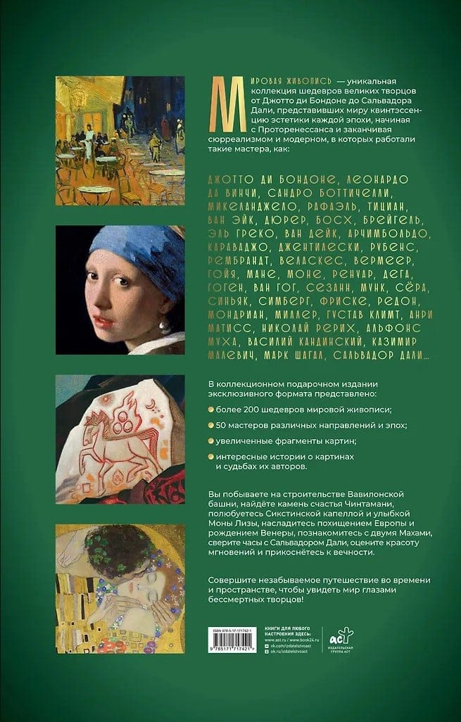 Коллекция шедевров великих творцов от Проторенессанса до авангарда и сюрреализма представляет квинтэссенцию эстетики каждой эпохи в истории культуры и её художественных направлений, в которых работали такие мастера, как Леонардо да Винчи, Микеланджело, Дюрер, Босх, Брейгель, Караваджо, Рубенс, Гойя, Мане, Моне, Ренуар, Дега, Ван Гог, Гоген, Мунк, Климт, Рерих, Малевич, Шагал, Дали… В уникальном подарочном издании эксклюзивного формата – более 200 шедевров мировой живописи 50 мастеров, а также увеличенные фрагменты картин и интересные истории о полотнах и судьбах их авторов. Вы побываете на строительстве Вавилонской башни, найдёте камень счастья Чинтамани, полюбуетесь Сикстинской капеллой и улыбкой Моны Лизы, насладитесь похищением Европы и рождением Венеры, познакомитесь с двумя Махами, сверите часы с Сальвадором Дали, оцените красоту мгновений и прикоснётесь к вечности.