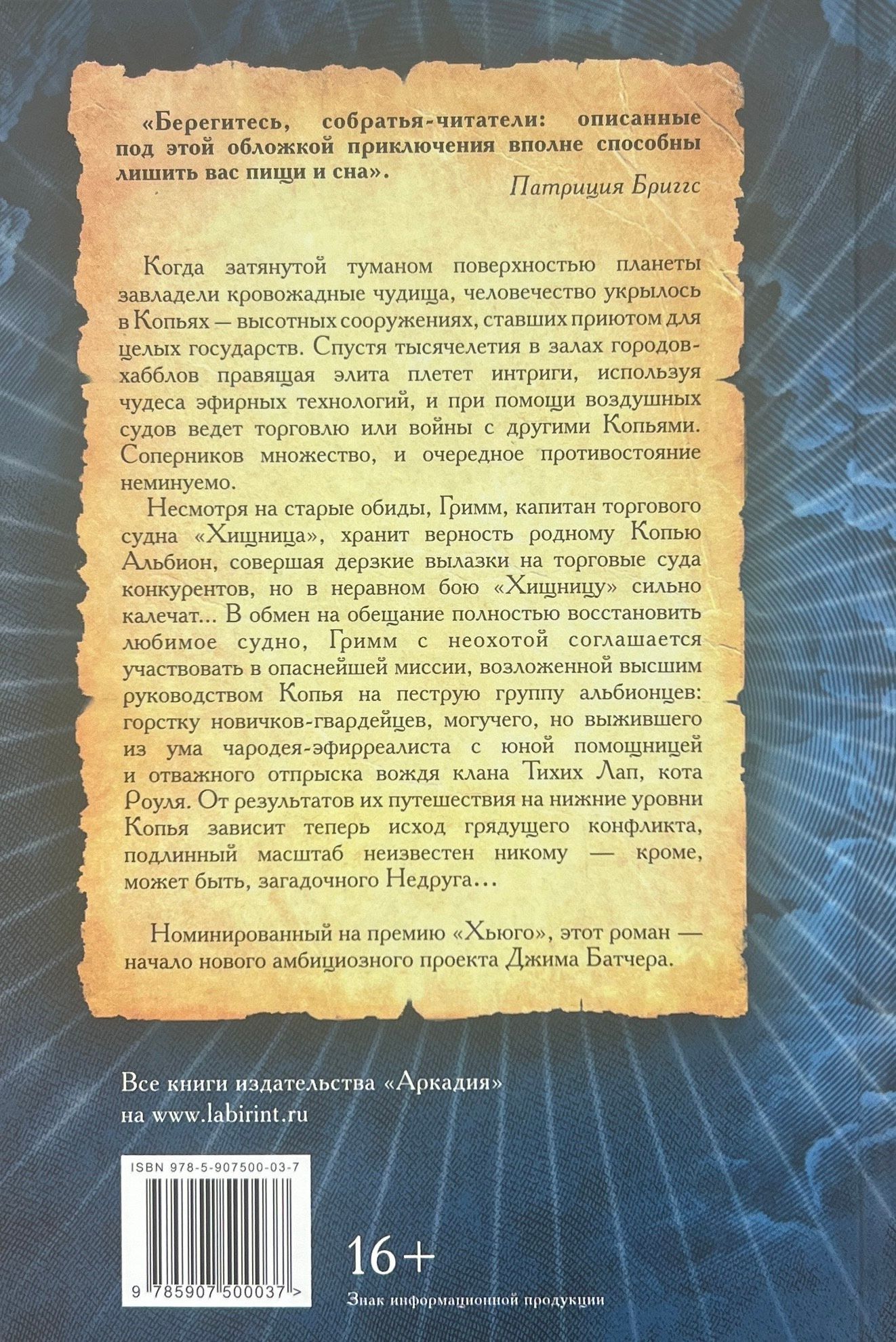 Джим Батчер - признанный творец миров и мастер лихо закрученных сюжетов, автор почти двух десятков успешных мистических триллеров, многие из которых стали лауреатами престижных премий, - снова удивляет и восхищает нас. Сплетая стимпанк, футуристическую антиутопию и героическое фэнтези в причудливое полотно, Батчер создал масштабную сагу об удивительном мире, где по покрытой туманом поверхности планеты рыщут чудовищные монстры, а вся человеческая цивилизация сосредоточена в Копьях - рукотворных башнях из пепел-камня. Род людской, как водится, погряз в интригах и конфликтах, а кое-кто ради власти готов даже вступить в сговор с абсолютным Злом… Им противостоит лишь горстка смельчаков да еще отважный отпрыск вождя клана Тихих Лап, кот Роуль. Сможет ли союз людей и кошек выполнить свою миссию или им придется сдаться на сомнительную милость Неведомых Сил?