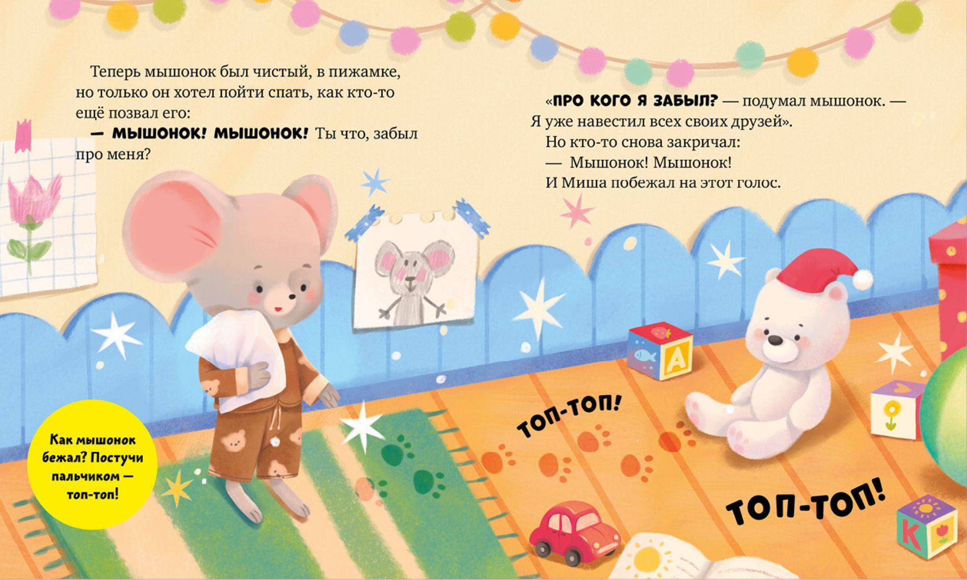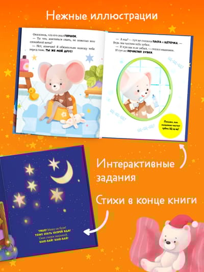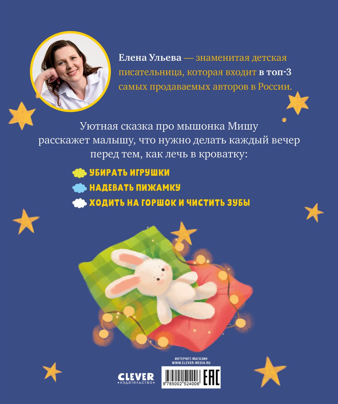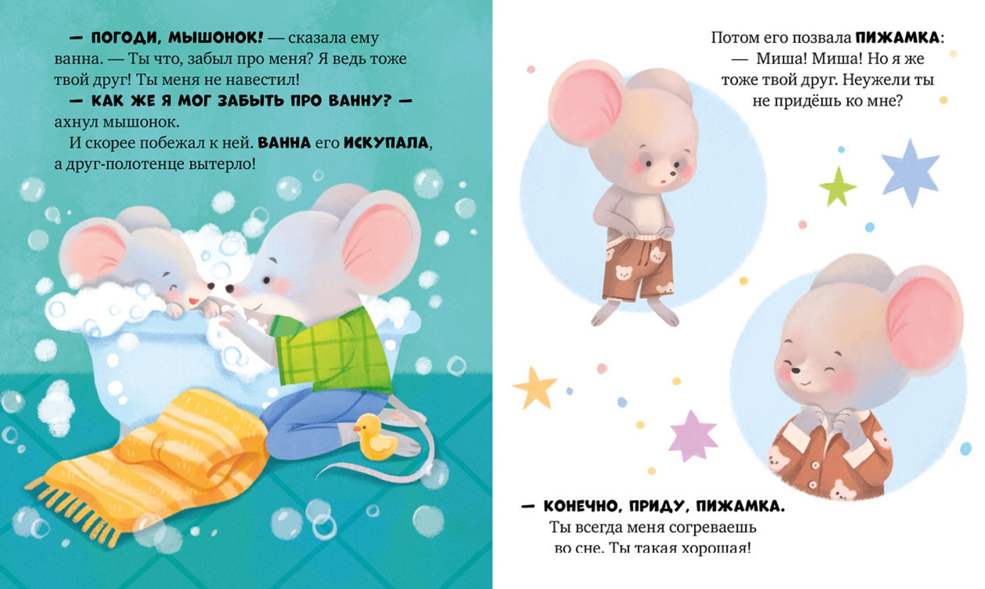 Вместе с мышонком Мишей ребенок узнает, что нужно делать каждый вечер, перед тем как лечь в кроватку: убрать игрушки, надеть пижаму, сходить на горшок и почистить зубы.