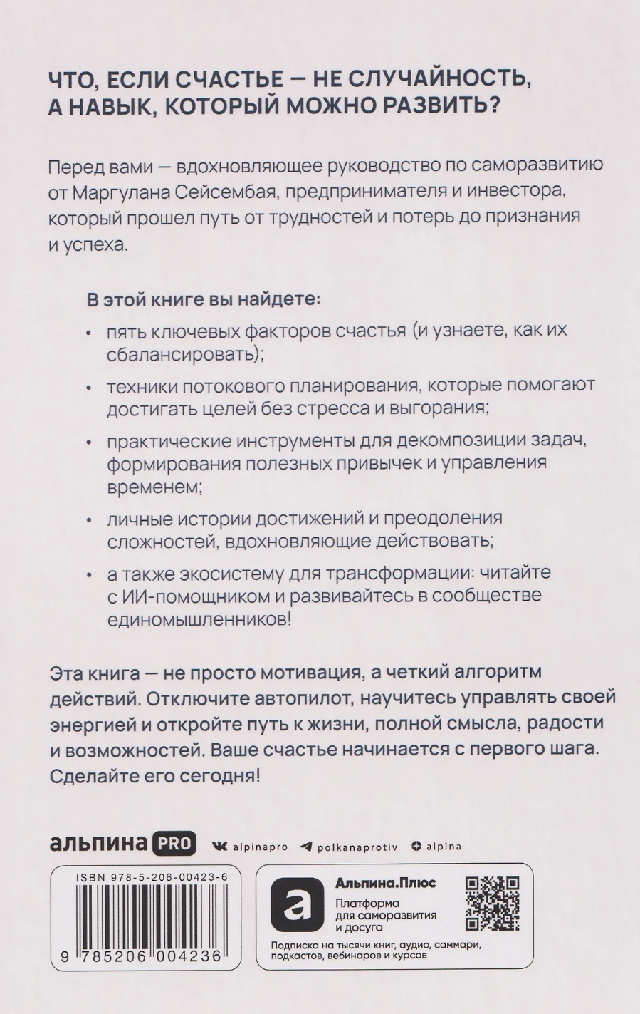 Начиная с понимания природы счастья как глубокого чувства удовлетворенности и выполнения своей миссии, Сейсембай раскрывает ключевые факторы благополучия: здоровье, безопасность, свободу, близких людей и любимое дело. Он предлагает практические инструменты для поиска собственной миссии, для управления энергией — главным ресурсом жизни, для постановки целей и потокового планирования. Читатель узнает о техниках декомпозиции, контейнеризации и кластеризации времени, а также о том, как формировать полезные привычки, избегать выгорания и находить баланс между работой и личной жизнью.