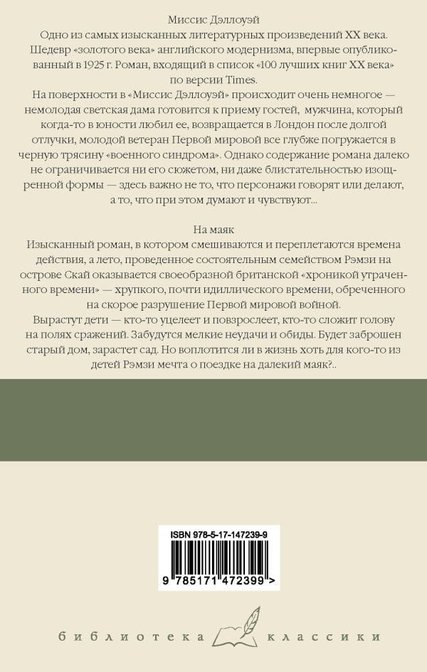В это издание вошли романы «Миссис Дэллоуэй» и «На маяк» — яркие образцы творческого стиля Вулф, в которых незначащие, повседневные внешние события практически неизменно представляют собой лишь канву для интенсивной и эмоционально напряженной внутренней жизни персонажей. Отказавшись от выраженного сюжета и единства времени действия, писатель освободила свою прозу от необходимости следовать четким правилам и дала простор не только поэтической образности своего языка, но и своему необычайно глубокому психологизму.