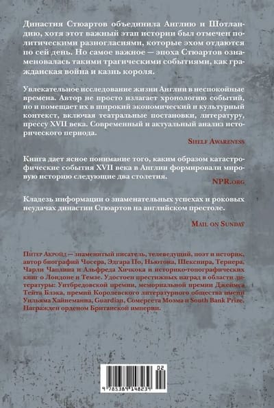 История Англии — это непрерывное движение и череда постоянных изменений. Но всю историю Англии начиная с первобытности пронизывает преемственность, так что главное в ней — не изменения, а постоянство. До сих пор в Англии чувствуется неразрывная связь с прошлым, с традициями и обычаями. До сих пор эта страна сопротивляется изменениям в любом аспекте жизни. Питер Акройд показывает истоки вековой неизменности Англии, ее консерватизма и приверженности прошлому. В фокусе этой книги — период английской истории, который ознаменовался правлениями Якова VI (Якова I), ставшего после смерти Елизаветы I первым Стюартом на английском престоле, и Карла I; двумя гражданскими войнами, победой парламента, промышленной революцией; протекторатом великого полководца Оливера Кромвеля, реставрацией Стюартов, правлением Карла II и, наконец, Якова II, свергнутого в результате Славной революции. На страницах живо предстает бурный XVII век с его политическими перипетиями и богатой культурной жизнью, примечательной литературой, включающей поздние шедевры Шекспира, якобинские трагедии, поэзию Джона Донна и Джона Мильтона, а также философский трактат Томаса Гоббса «Левиафан». Как это свойственно сочинениям Питера Акройда, в книге дается широкое представление о жизни обычных английских подданных на фоне постоянных социально-политических потрясений и неопределенности. Многогранное историческое повествование прекрасно дополняют 36 иллюстраций на цветной вклейке.