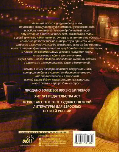 «Мятная сказка» – культовая книга, принесшая своему автору феноменальную известность и любовь читателей. Александр Полярный писал эту историю в течение трех лет, выкладывая главы в своей группе во «ВКонтакте». Отрывки и цитаты из «Сказки» мгновенно разлетелись по интернету и принесли книге широкую известность еще до ее издания. Всего за два месяца проект получил финансирование на краудфандинговой платформе, и Александр своими силами успешно выпустил книгу, которую так ждали его поклонники. Перед вами – новое, подарочное издание «Мятной сказки» с цветными иллюстрациями Ульяны Никитиной.