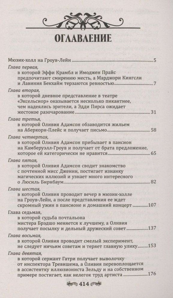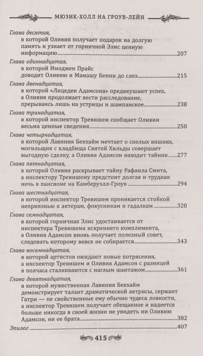 Однако труппу с самого начала театрального сезона преследуют неудачи. Травмируется одна танцовщица, затем погибает другая – и Филипп Адамсон, антрепренер труппы, вынужден обратиться за помощью к сестре. Этой зимой Оливии Адамсон предстоит не только вникнуть в хитросплетения закулисных интриг, но и попробовать себя в амплуа ассистентки иллюзиониста и полицейского осведомителя, а также спасти от петли невиновного, разоблачив истинного преступника. Но как понять, какие чувства таятся за улыбками и ярким гримом? Как распознать, кто лжет, а кто говорит правду? Третья книга серии о расследованиях близнецов Адамсон понравится любителям классических английских детективов. До встречи в мюзик-холле на Гроув-Лейн.