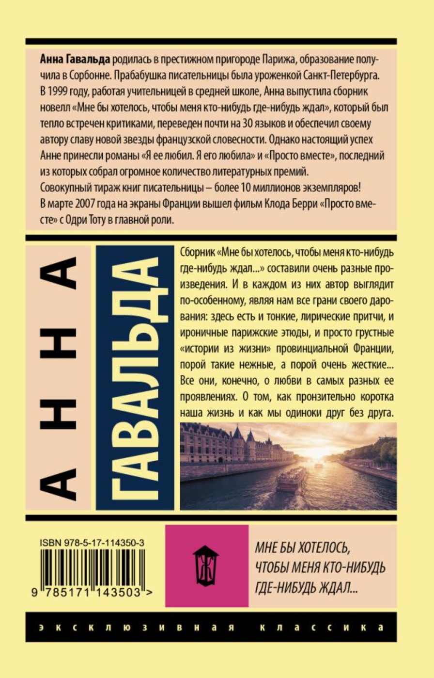 Анна Гавальда, известная французская писательница, покорившая мир своими романами и их изысканным, поэтическим стилем, начинала как автор новелл. Сборник «Мне бы хотелось, чтобы меня кто-нибудь где-нибудь ждал» составили очень разные произведения. И в каждом из них автор выглядит по-особенному, являя нам все грани своего дарования: здесь есть и тонкие лирические притчи, и ироничные парижские этюды, и просто грустные «истории из жизни» провинциальной Франции, порой такие нежные, а порой очень жесткие... Все они, конечно, о любви в самых разных ее проявлениях. О том, как пронзительно коротка наша жизнь и как мы одиноки друг без друга.
