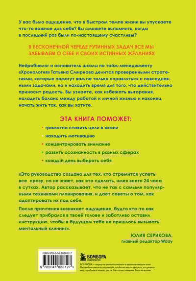 Нейробиолог и основатель школы по тайм-менеджменту «Хронология» Татьяна Смирнова делится проверенными стратегиями, которые помогут вам не только справляться с повседневными задачами, но и находить время для того, что действительно приносит радость. Вы узнаете, как избежать выгорания, наладить баланс между работой и личной жизнью и, наконец, начать жить так, как вы хотите.