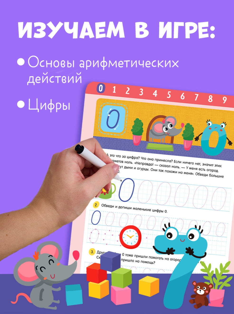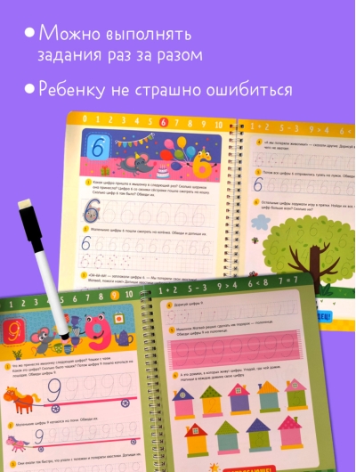 Многоразовая тетрадь-тренажер поможет ребенку научиться писать цифры и освоить навыки простого счета в процессе веселой игры! Добрые сказки вовлекут в процесс обучения, а милые герои обеспечат прекрасное настроение и помогут справиться с заданиями.