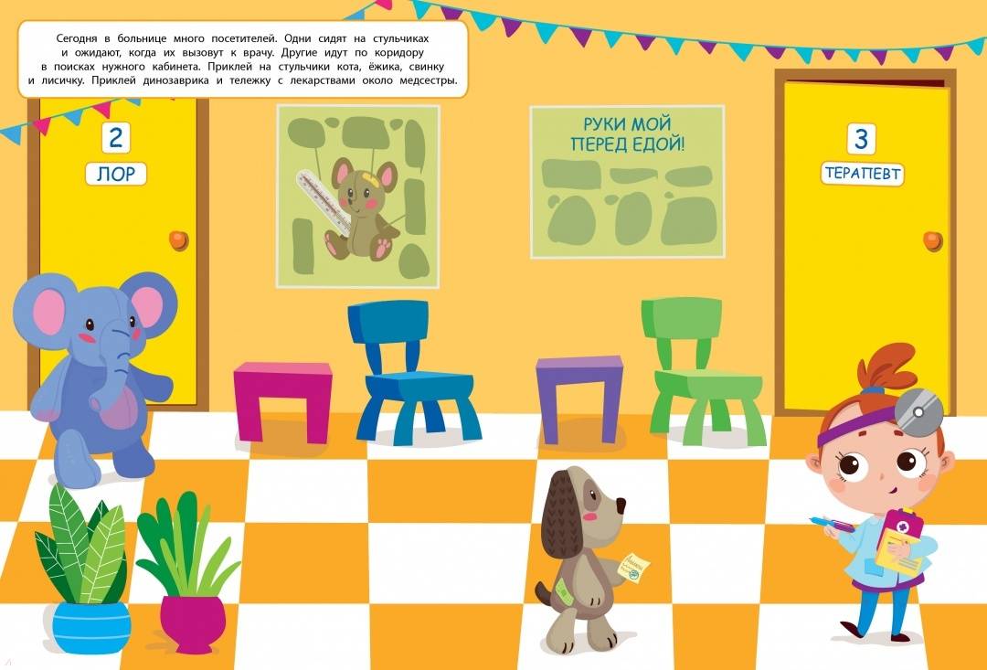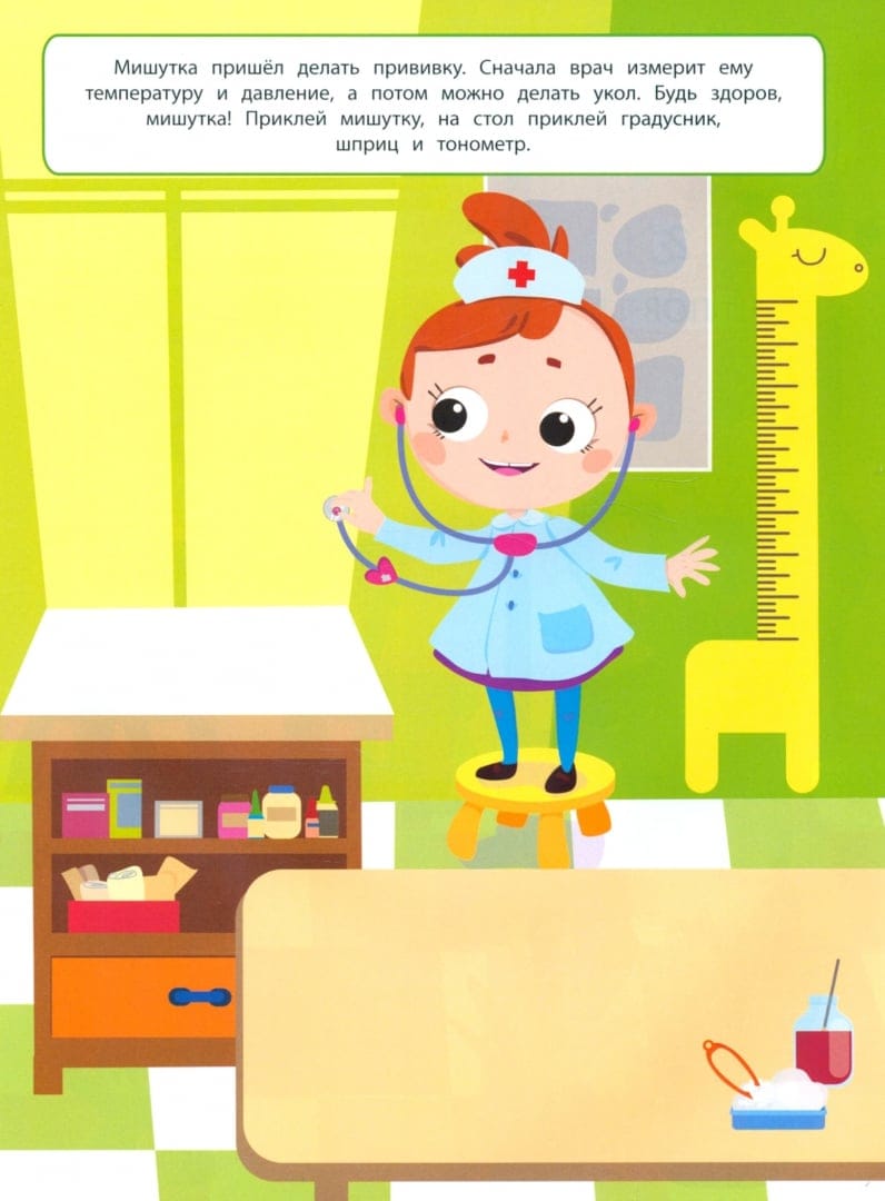 С этой книжкой ваш малыш сможет стать самым настоящим врачом! Игрушки уже выстроились в очередь. Им нужно сделать прививку, наложить гипс, проверить ушки, исследовать анализы, выписать рецепт. Приклеивайте картинки и придумывайте свои истории с игрушками. Наклейки в книжке многоразовые, поэтому можно приклеивать их снова и снова! А самое главное - не бойтесь врачей и не болейте!